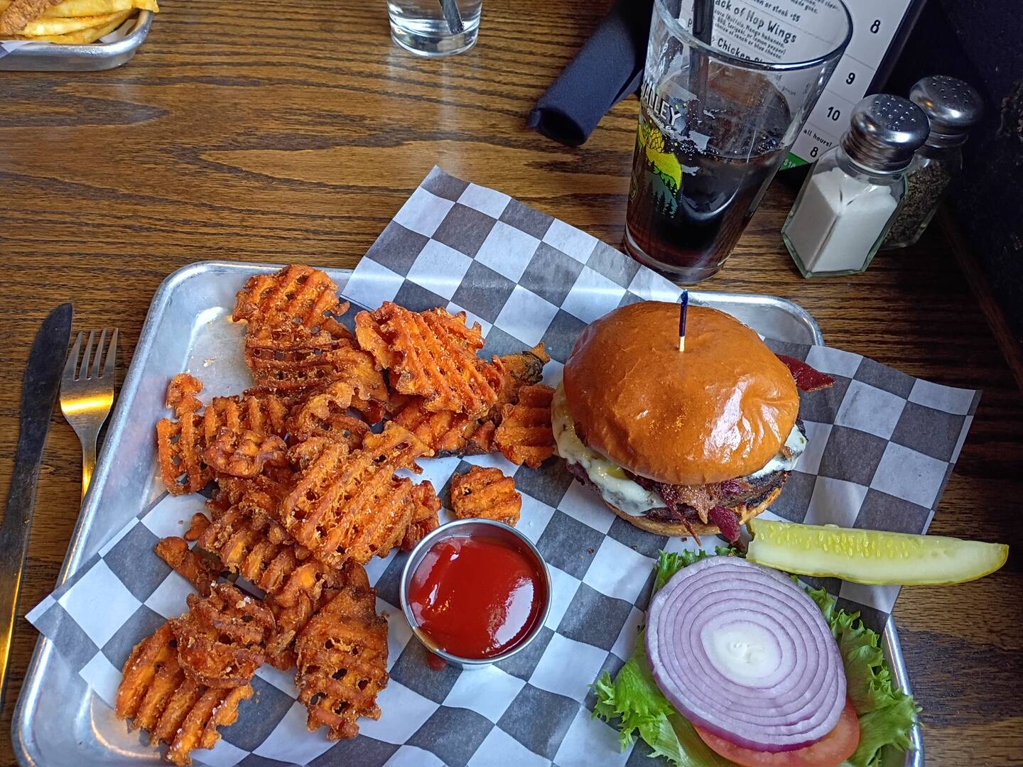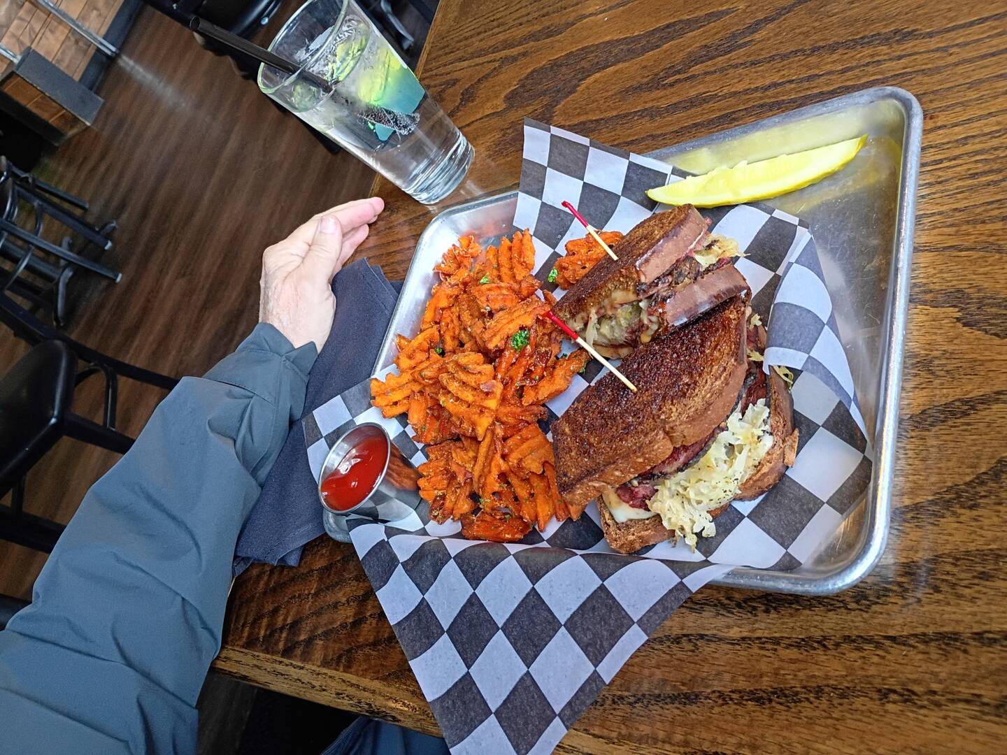 My burger.... Dane's Reuben sandwich... and Chuck's Chicken Fingers