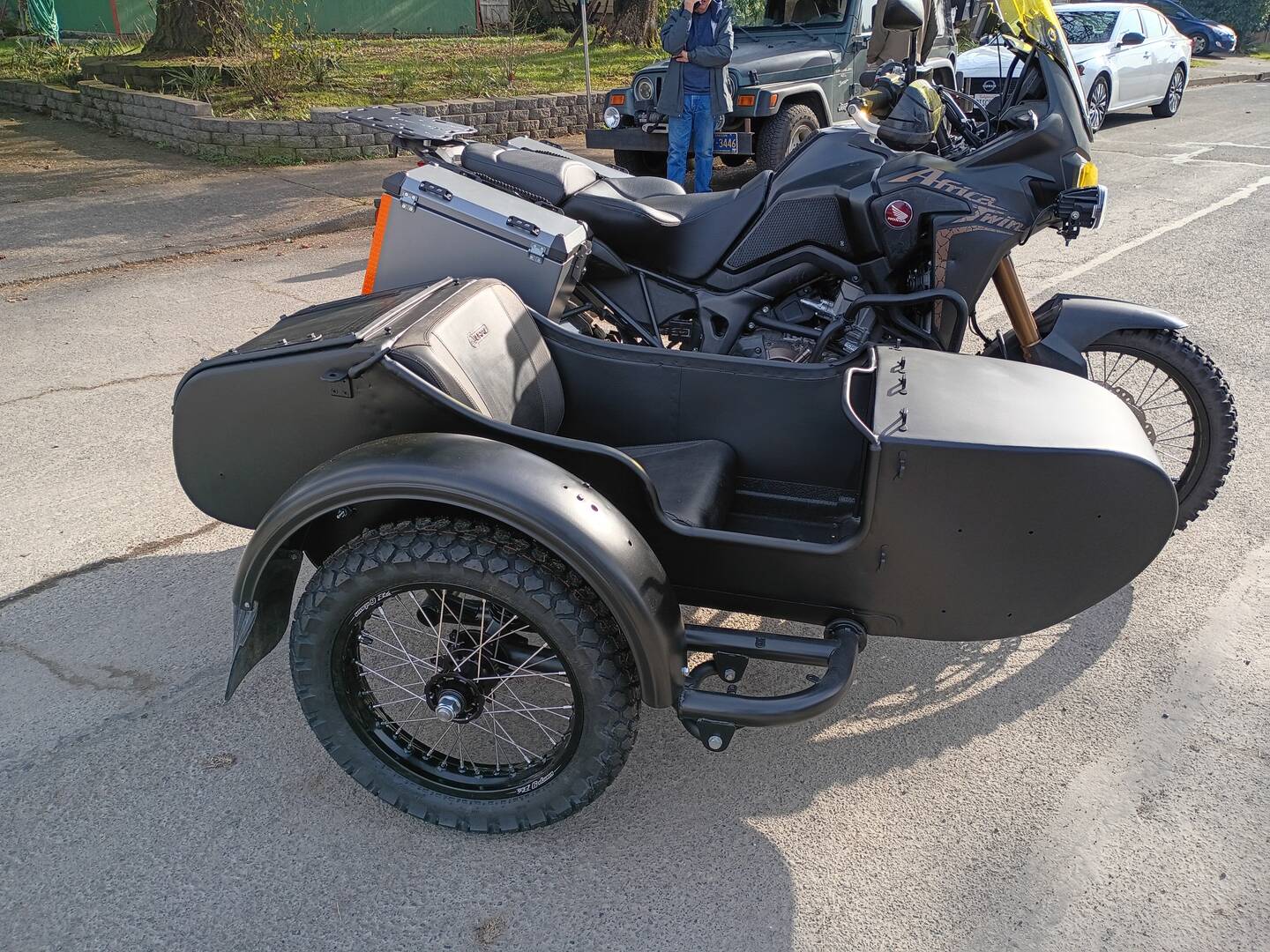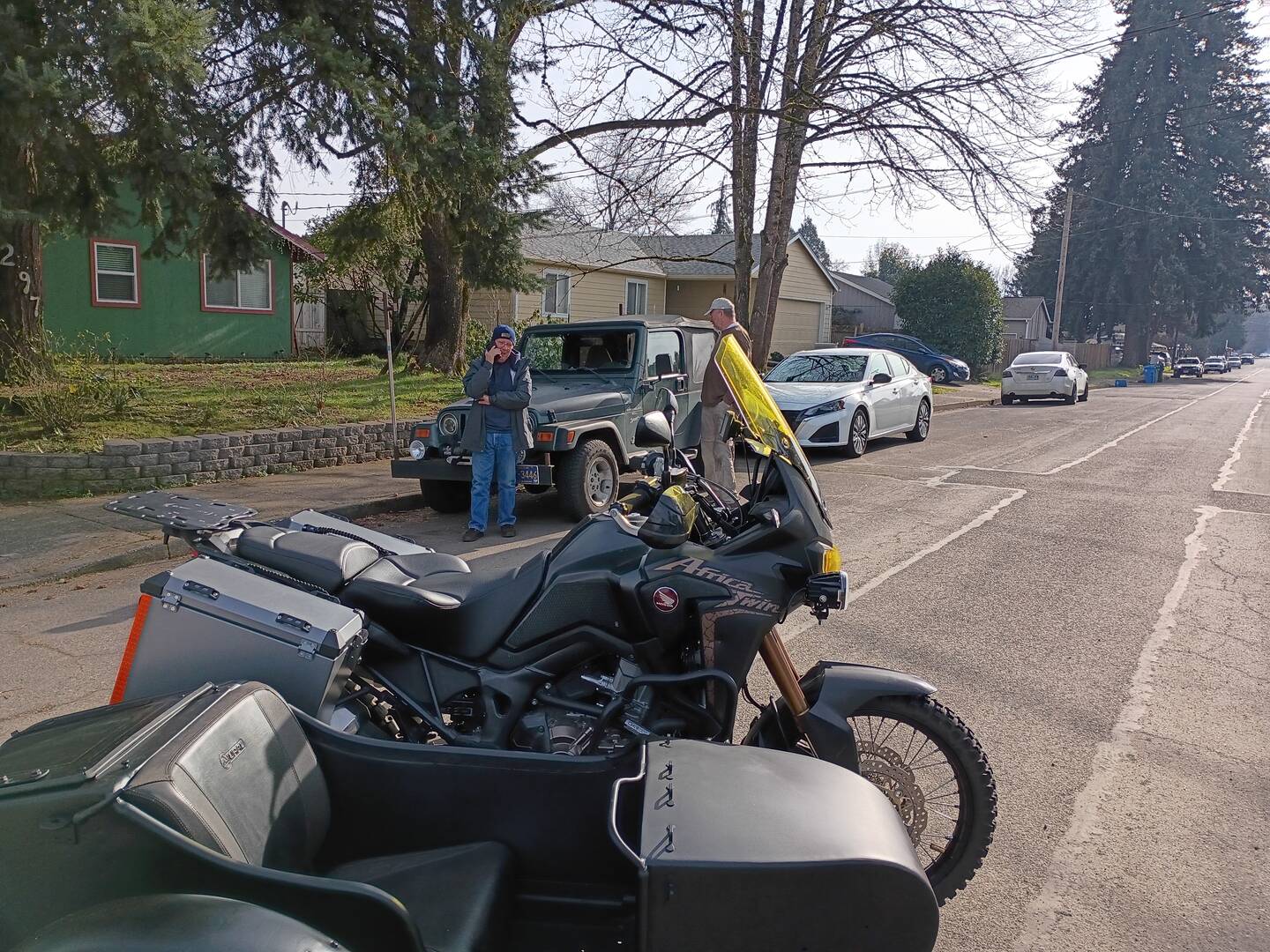 And then...Chuck and Dane and I all took turns driving my Africa Twin sidecar rig up Chuck's street, just to test it out.