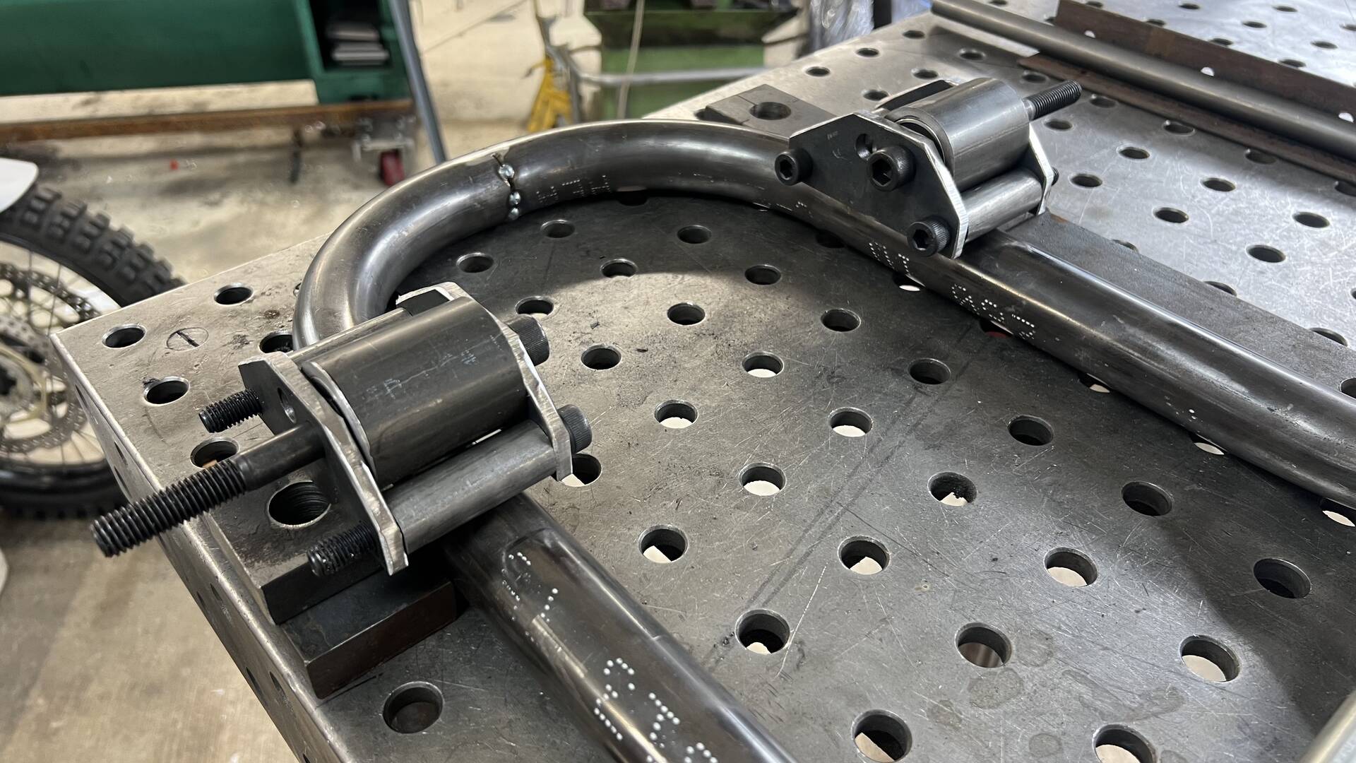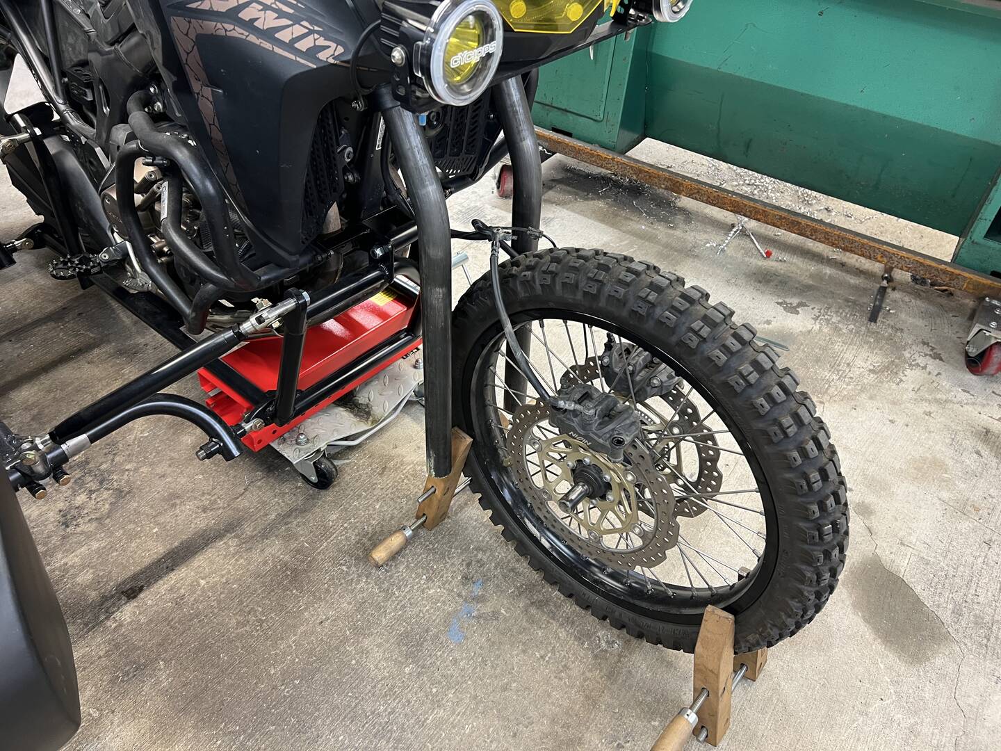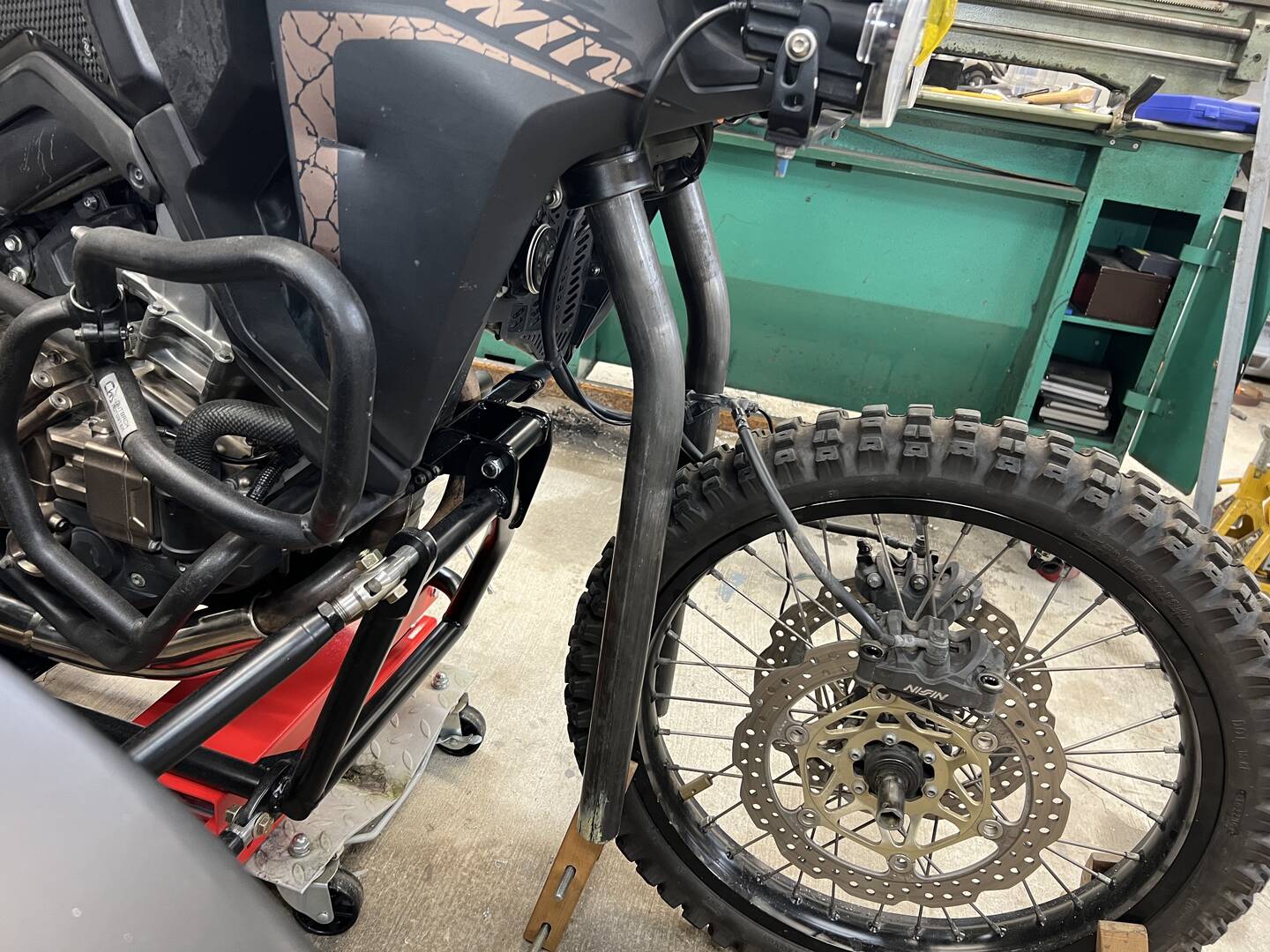 However Chuck has really learned a lot on building these Leading Links for the front of Africa Twins, and whilst mine is # 3 for Chuck, the one on Chucks lift table, a job through Mike Paull, is the # 4 Leading Link front end that Chuck will be building, for a lovely lady Ellen, on her 2024 Africa Twin Adventure Sports.