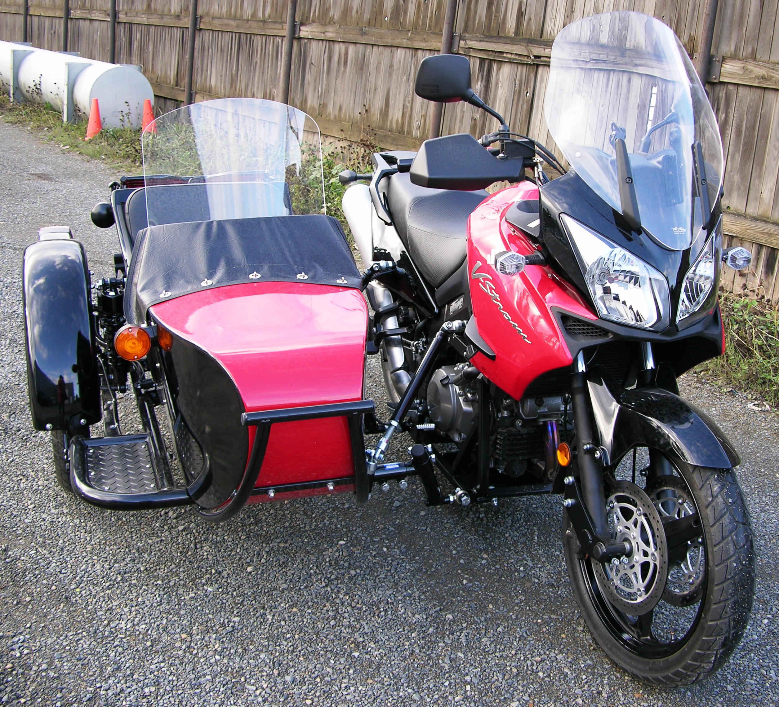 What we run on the front of the V strom rigs is what we call "leading" legs which bolt to the bottom of the fork like in this photo of a V strom with our M72D sidecar