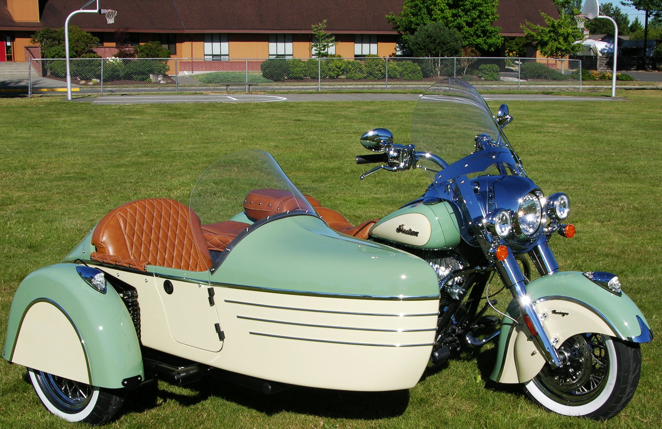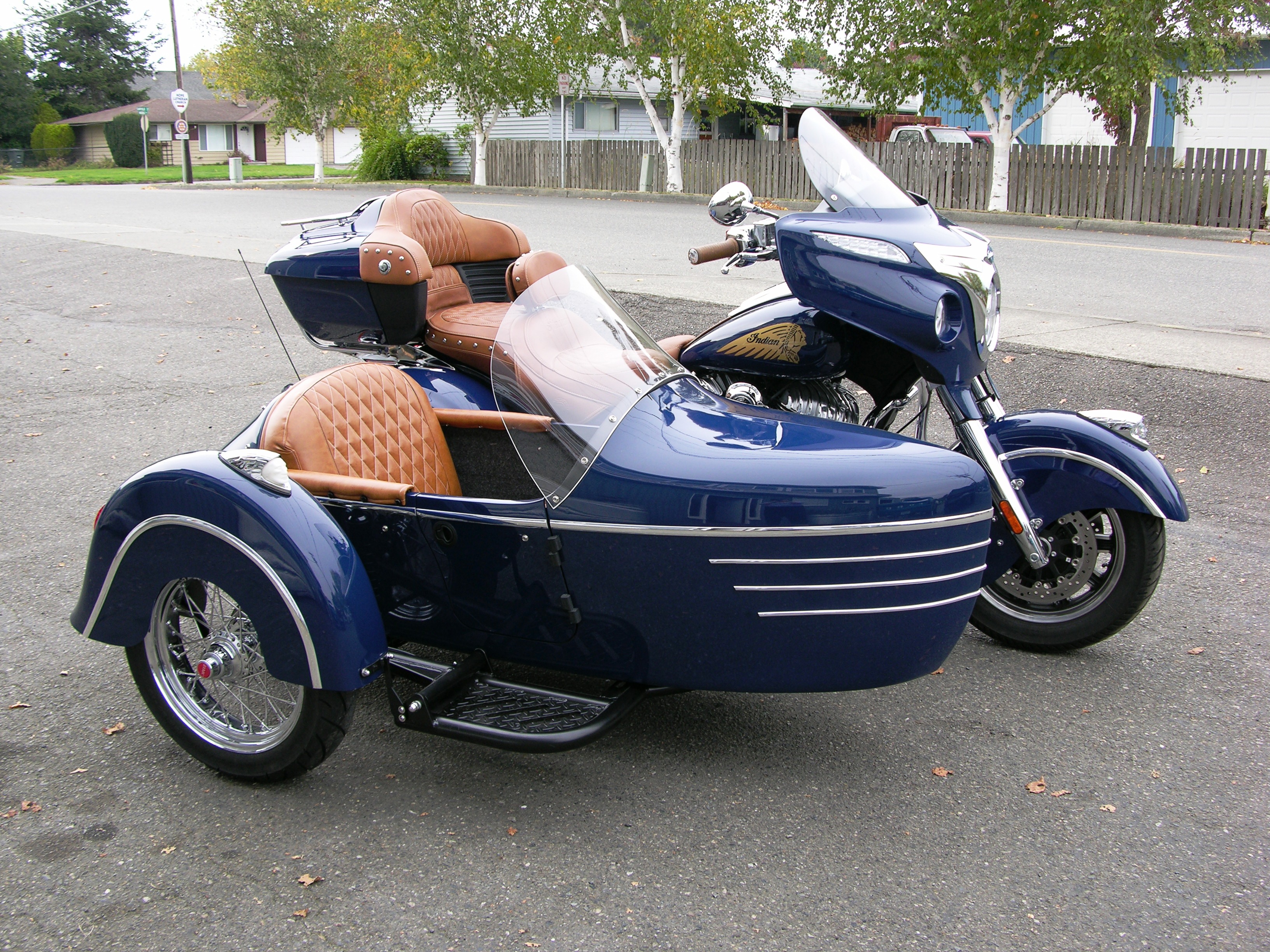 That is one of our Heritage Sidecars on the Indian in your post. It is equipped with Electronic Camber Control, Progressive Coilover suspension on an independent swingarm assembly and Brembo brrake rotor/caliper with Spiegler stainless steel lines and a quick disconnect on the brake line for ease of removal when detaching the sidecar. All of our sidecars can be removed in approximately 15-20 minutes with just 2 common tools should you need your two wheel bike back for service or any other need. If this is the unit I'm thinking it is there is also a cupholder, 12v plug and dual USB charging station inside the car, PIAA 55watt driving light fully adjustable automotive seat and several other features.