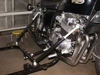 I used generic Velorex mounting system which uses the right side motorcycle frame only.