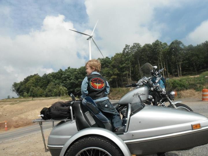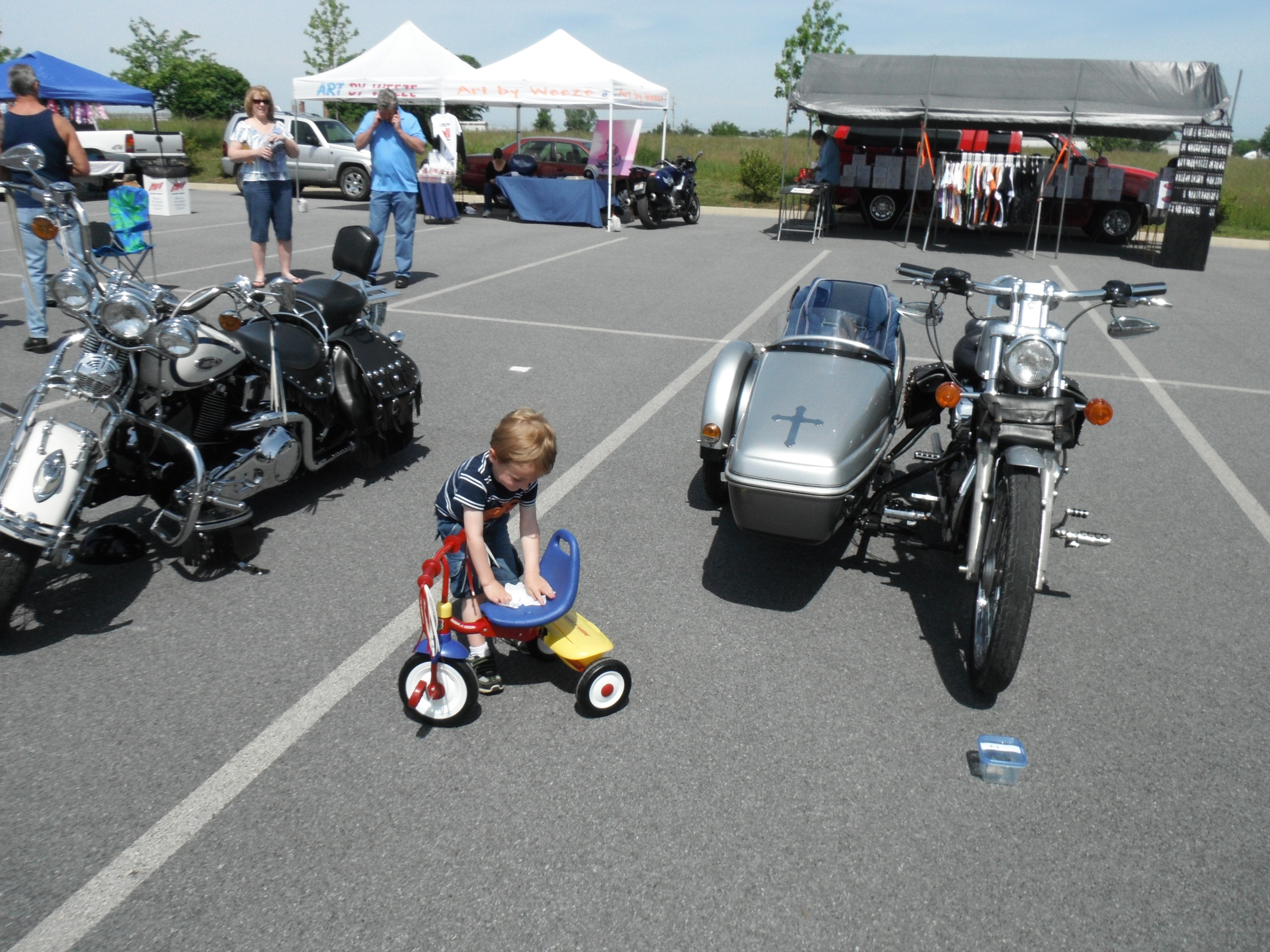 In May we set up our BFC tent at the 2nd Annual Thunder Roads West Virginia bike show at Grove's. I brought Aiden's tricycle again and this time he decided not to ride it but rather to enter it in the bike show as well as our sidecar rig. Since all the other guys were polishing their bikes Aiden got out one of his diaper wipes and began polishing his tricycle as well. That is when I told Aiden " It just ain't respectable to ride around a bike show all day on a stock tricycle" so we are in the process of building him his own "tricked out trike". We rode with the Alternative MC on a benefit ride to Capon Bridge for a pig roast and music , and along the way we followed the river and had an Eagle fly along side of us for about 2 miles . Our friends with 2nd Thief M/M hosted a biker blessing at Shenandoah H-D in Staunton VA so we rode down to hang with those guys for a few hours and Aiden got to watch the Riders Edge class out back of the dealer ship learning how to ride. We have gone to Hagerstown mall, Charles Town Home Depot , The Cone Zone Cruise In's many times this year . Met up with the United States Military Vets M/C for a few of their event this year , one ending at the American Legion in Winchester VA and one at Shipwrecked in Martinsburg . We got to do a benefit ride for breast cancer with the Down n' Dirty M/C in Charles Town. Now that ride was an eventful one . We rode over to Frederick H-D and then off to Hagerstown MD , now here is where it gets interesting, we were in Hagerstown near the park as we left our stop the group entered a roundabout and we were number 7 bike in the line as we were coming around the circle(we are already in the circle we have the right of way) a bus enters the circle without slowing cutting in front of me and Aiden. I was able to avoid the bus but the sudden maneuver caused me to twist my right side controls and pinch the ignition switch wires and shut down my engine . There were no collisions and the bus just drove on as if nothing happened. I on the other hand had to call for a trailer till I could diagnose the problem at home. Memorial weekend we rode to Gainsville VA to meet some other WV BFC chapters on their annual trip to Rolling Thunder and hung out at a campsite with them all day and of course we had to go for ice cream before we left for home(we like ice cream)