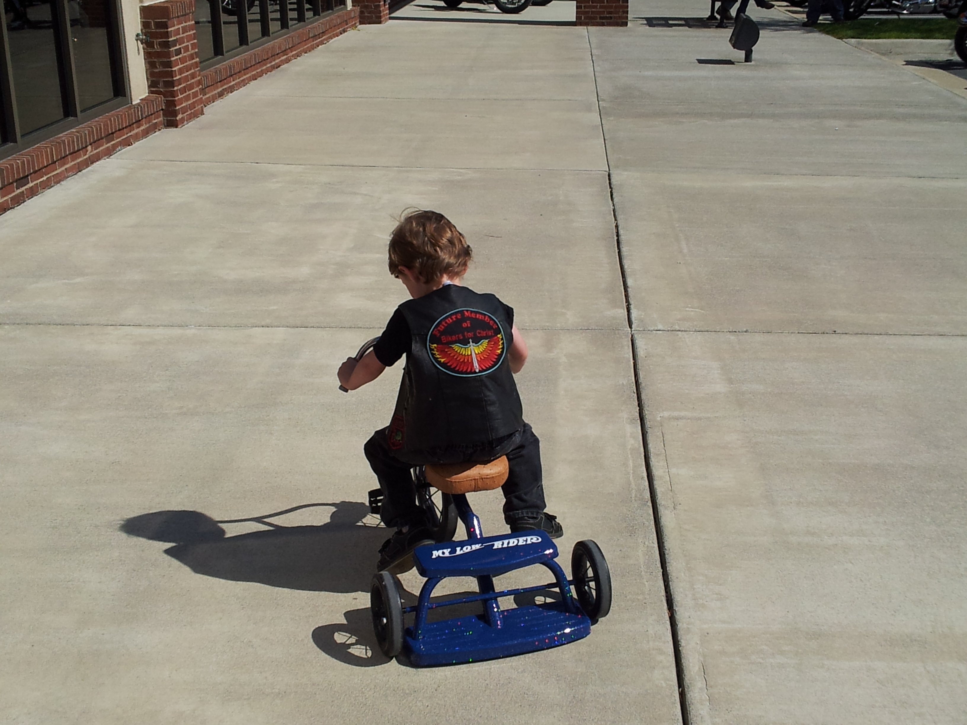 This year started out pretty good. In April we set up our BFC tent at the Swap Meet at Grove's Harley Davidson and hung out all day with some really cool folks and Aiden rode his tricycle around all day wearing his "colors", leather jacket and skull cap. That day we bought a used Scala Rider communication device so he could talk to me while riding , now there is nothing better than a 3 year