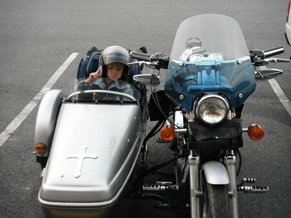 In August 9, 2008 along with 7 other friends we started a chapter of Bikers for Christ .Aiden Plotner born 3-15-2009 to my then 15 year old daughter. In the fall of 2009 I was given the leadership of this chapter of BFC . Kristie and I took custody of Aiden in the fall of 2010 at that time I had already been looking for a sidecar since the spring of 2010 . being unsuccessful in finding a sidecar (every one I found was $2000 to $3000 , it needed restored and it was at least 600 miles away) and I was at a loss as to why the wife and I both had almost new motorcycles , leadership in a Motorcycle Ministry and now a grandson who was to small to ride living in our house under our care.I realized I had not prayed and asked God what his plan was for me , the BFC ministry I was a part of and how Aiden fit into all of this. I stopped all my searching a wondering and prayed and asked God to show me the direction he would have me go. Surprise --the next day my email had ONE Ebay notification , the sidecar I now own. The wife and I discussed how much we had to bid on this particular sidecar and I placed my maximum bid. It now made ONE automatic bid and the other 3 bidders stopped there. I won the sidecar with just that one bid 26 hours later. Now here's the story , One bid, drove 61.7 miles to pick it up , DID NOT paint it to match my bike. Better story is , after researching through the United Sidecar Association website I found out it is a1974-1980 Velorex 562 , the seat is about 5 inches taller than original( it matches the height of his car seat), there was a seat belt already installed(sidecars don't come with seat belts) , a roll bar behind the seat( I attach the upper tether on his car seat to it). So in all this it is like this sidecar was being built for Aiden to ride in and be attached to my Sportster since the '70s.