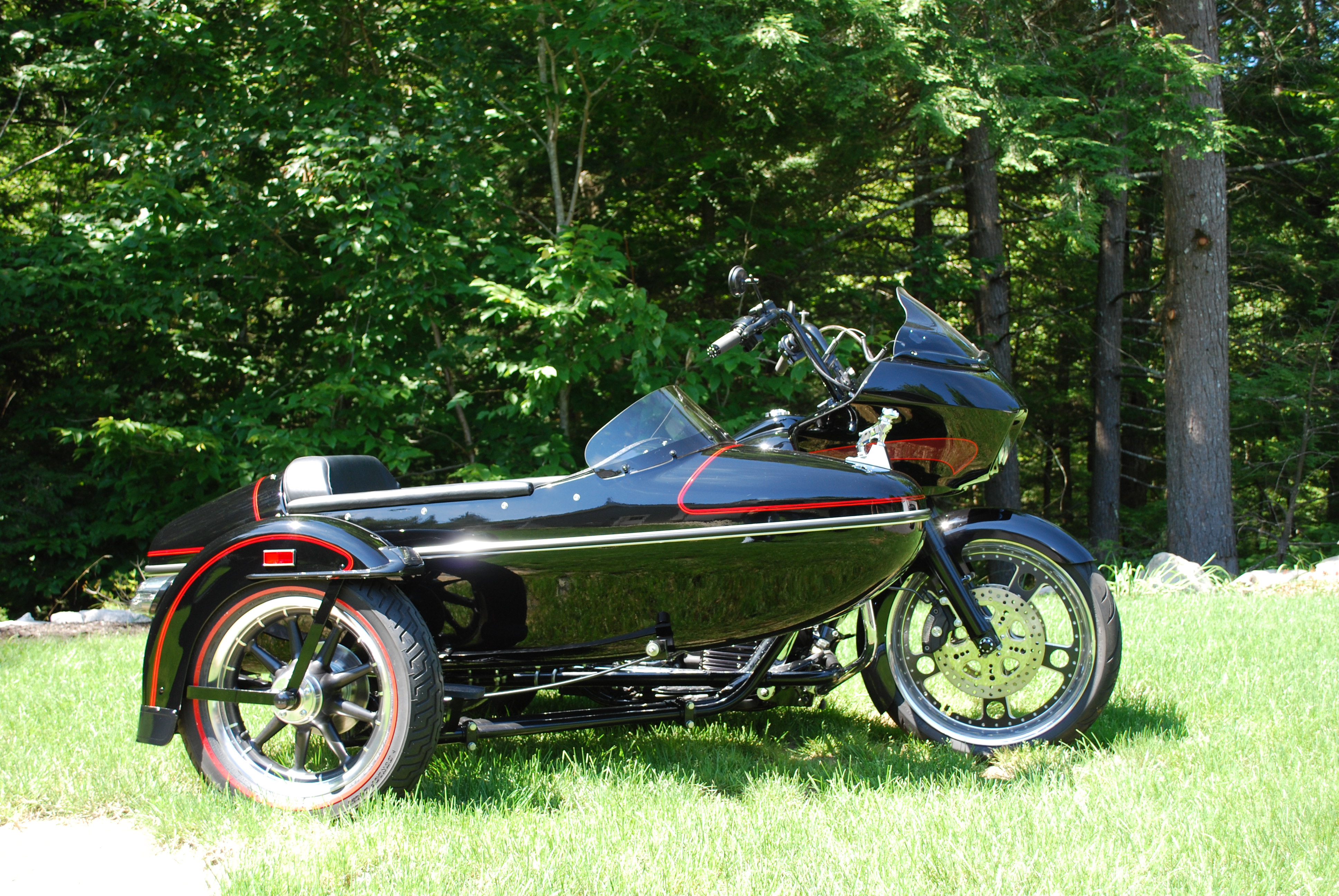 Can't believe its been almost a year since I bought the hack to go on the Harley. As a guy thats been on bikes since the mid seventies mid way through the summer I was jonesing to ride on two wheels so I disconnected and spent a month riding just the bike. During this time I had some work that needed to be done to the bike and I had to have the stripes on the car painted to match the bike. Also while the car was off I spent alot of time bike shopping for something cheap tp ride when I didn't want to ride the sidecar. Finally found an 07 Suzuki V-Strom 1000 with 4000 mile that I was able to pick up for 5500. For me this is the perfect second bike, fun to ride yet powerful and quiet. After that the rig was reassembled and will now stay that way. During the reassembly I did my yearly detail and took some glamor photos of an awfully clean rig. Having just had surgery on my hand I finally took the pictures off my camera and thought I'd post up a couple..