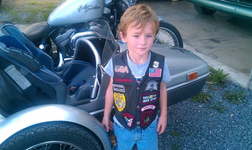 Found this picture from the first day we got to ride the sidecar back in July of 2011. Then the next one from just this past summer with his new patches.