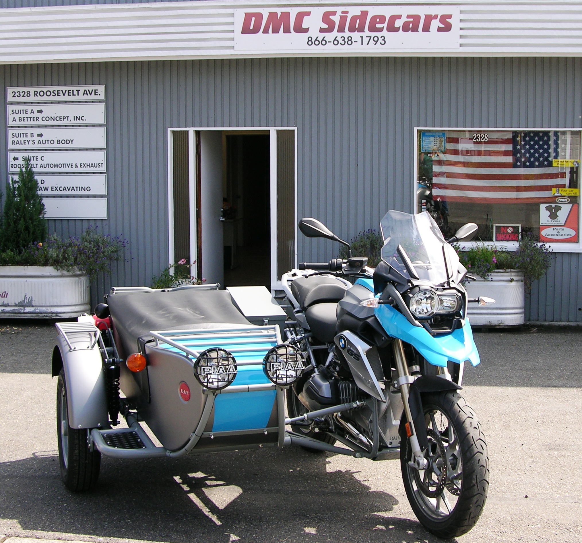 Thought I would post photo's of perhaps the only new BMW R1200GSW (water cooled) sidecar bike in the world. This is our demo bike, every thing on it is tooled for production for both left and right side mount. This rig has the front end modified for easier steering with a new from billet ball joint mount. An automotive wheel and tire on the rear of the bike that interchanges with the sidecars wheel. Disk brake on the sidecar on its own independent hydraulic system. Electric trim, matching paint, front rack, rear heavy duty rack, fender rack, front bumper with PIAA lights, full carpet, heated seat, two tone seat, tonneau cover, side door, trailer hitch windshield, roto pax fuel and water canisters, power out lets in both BMW type and cigarette lighter type. We also powder coated every thing grey to match the frame of the bike.