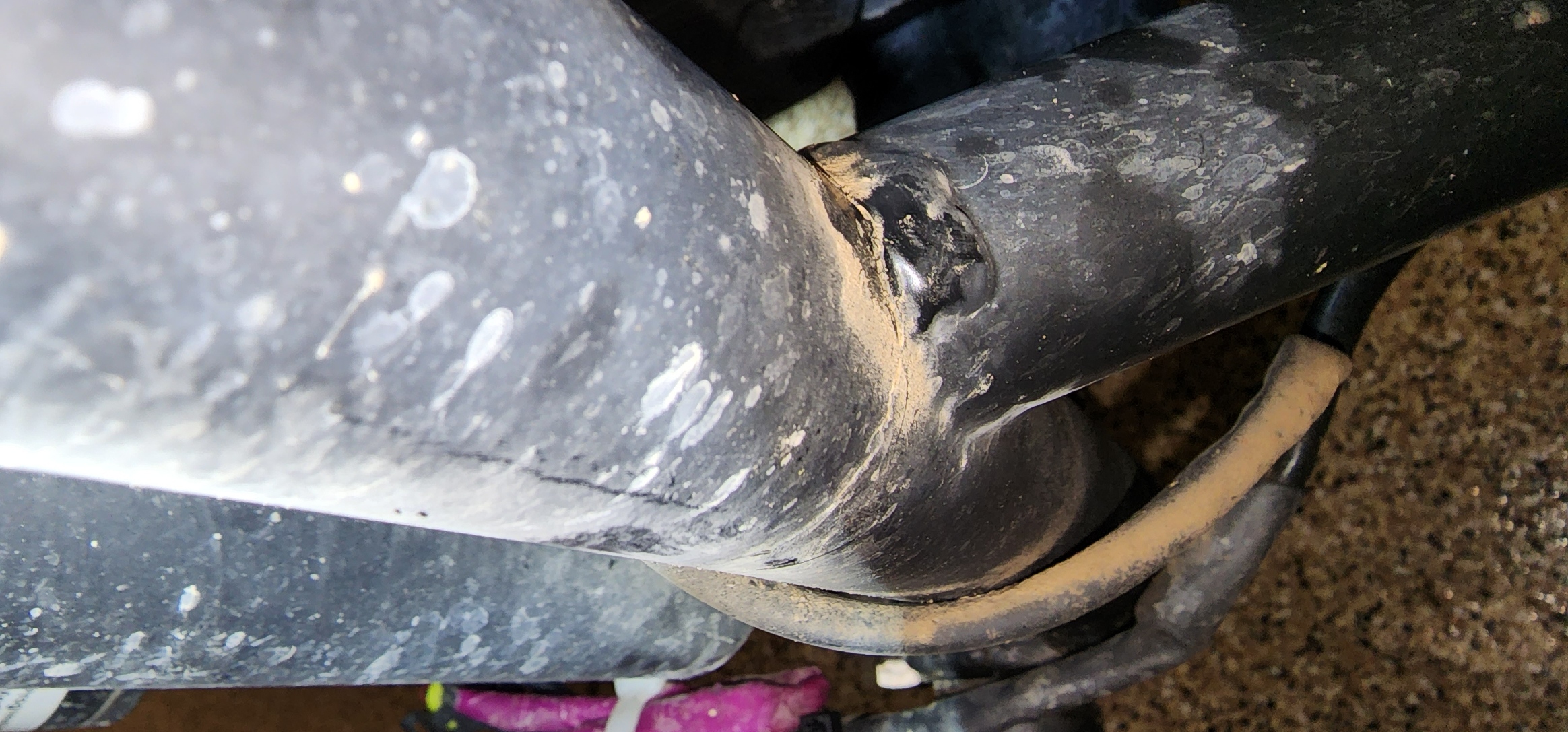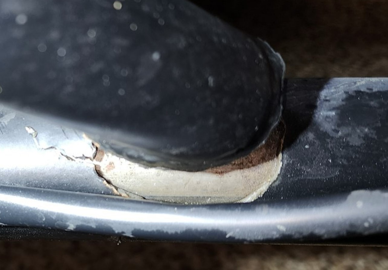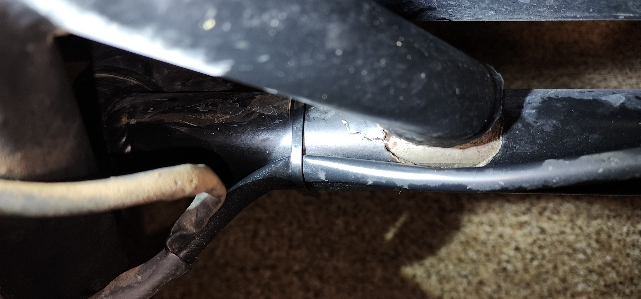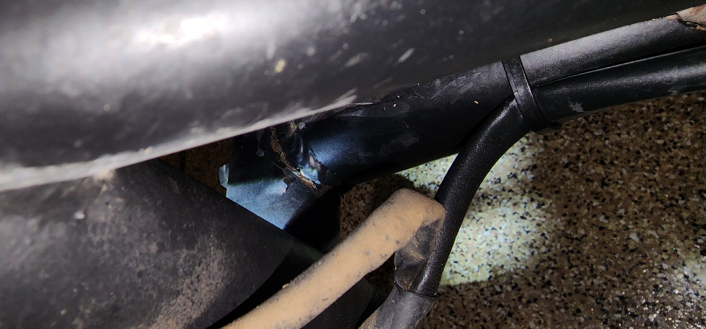 Here are a few photos taken this evening of the multiple breaks I found in the frame of my DMC Expedition sidecar, delivered on September 7th, 2022. I found these during my inspection, while diagnosing another design problem with the hack wheel shock system.