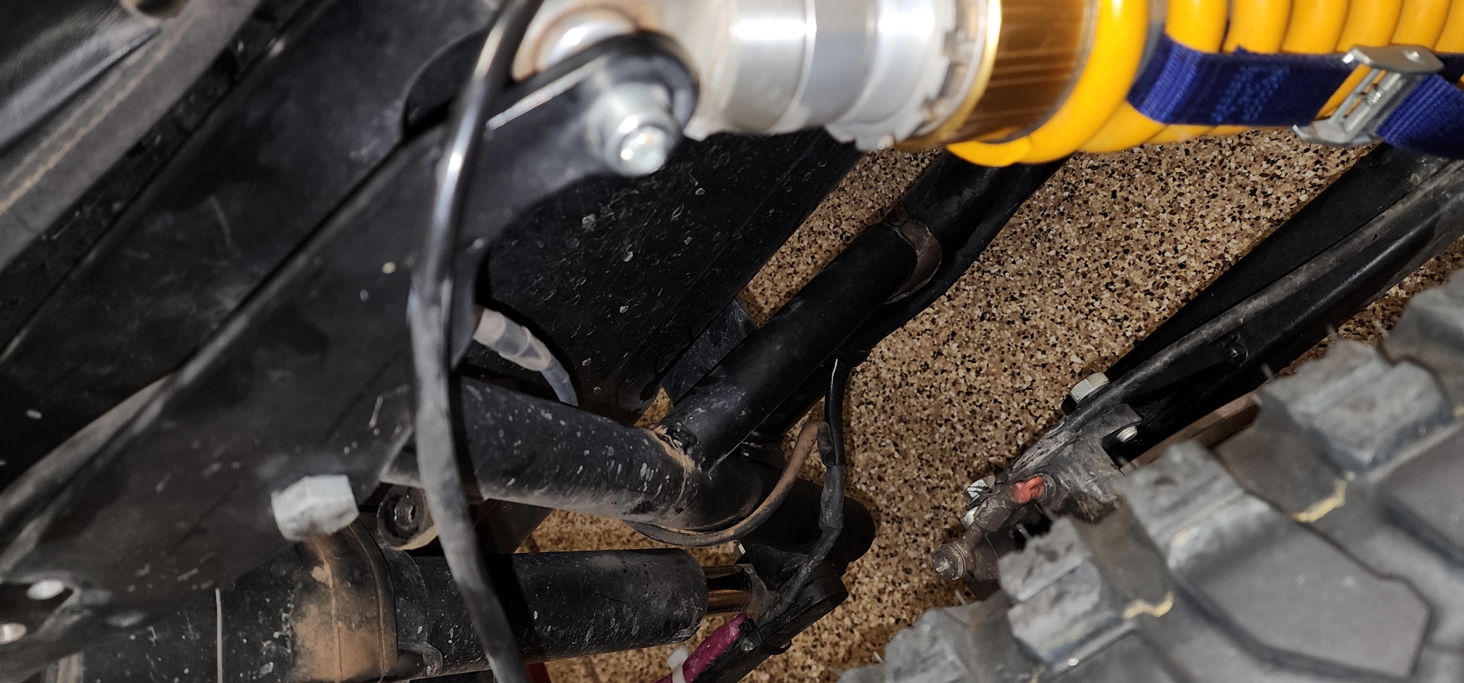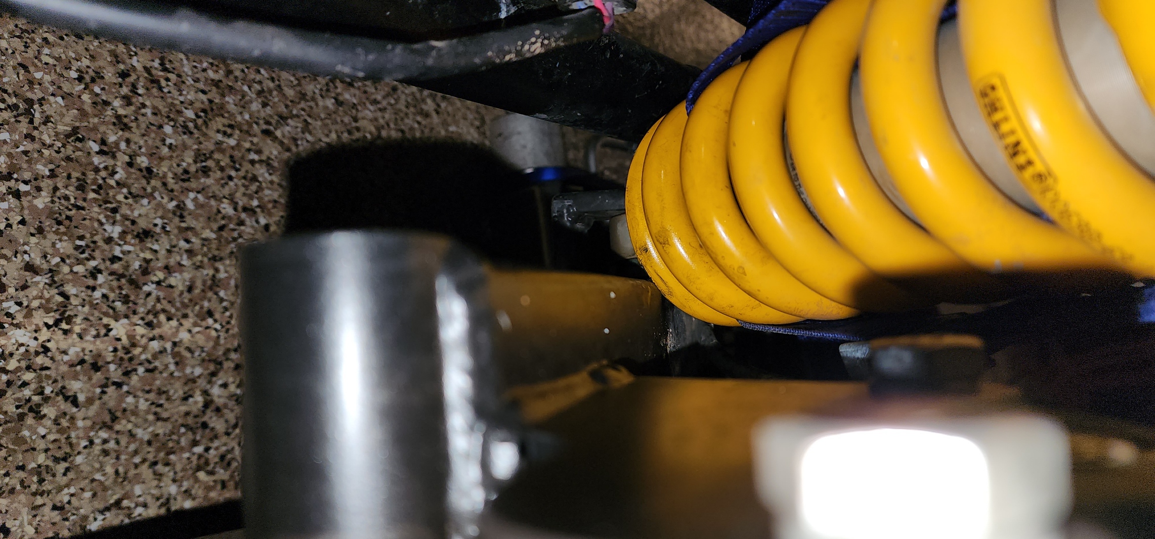 The shock was actually canted back, so the lower spring collar served as the hard stop, when it hit the swingarm. This put enough sideload on a new Ohlins shock to blow the shock out.