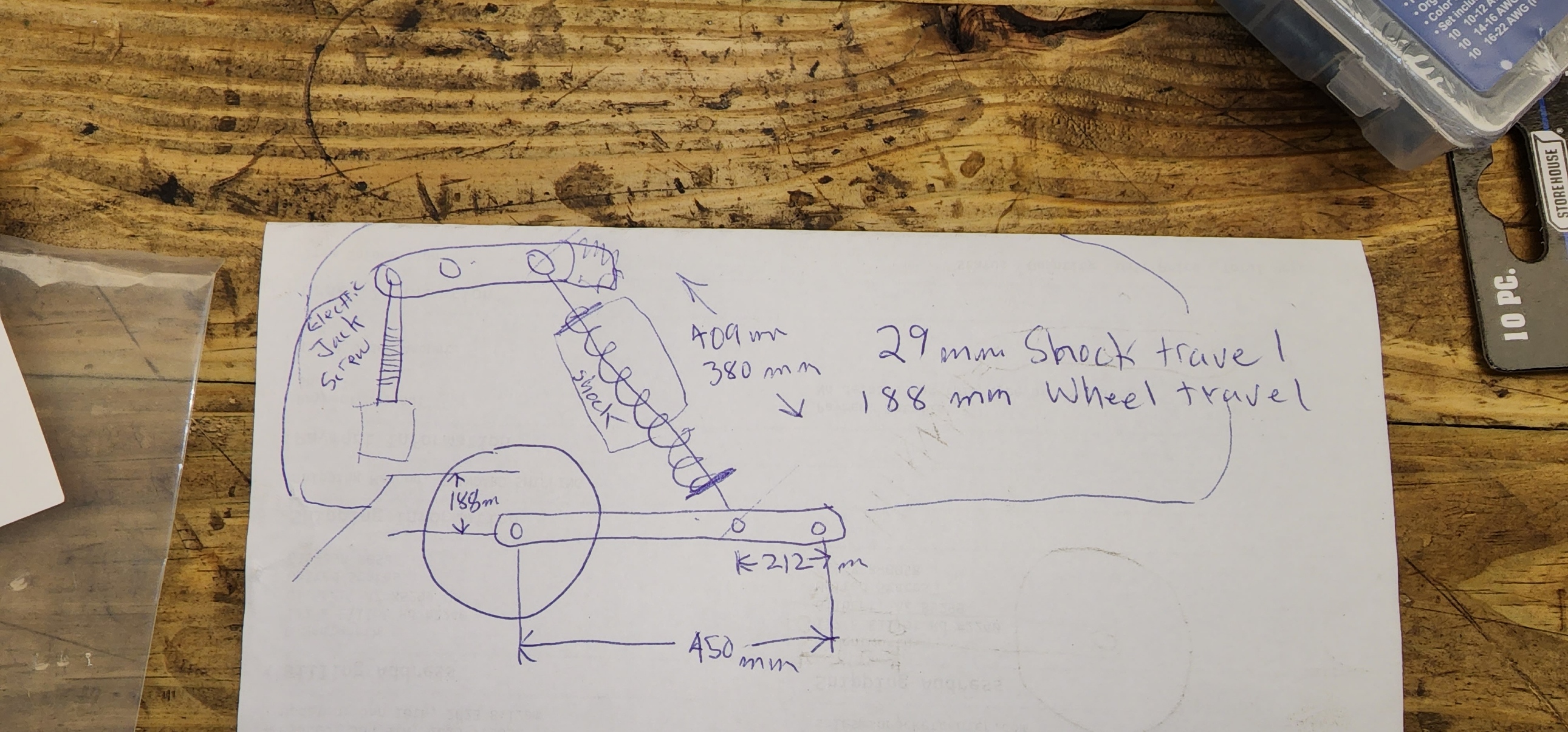 This very crude, not to scale sketch, shows that it was delivered with a 6.5 to 1 ratio of shock compression to wheel travel, with the shock leaning backwards to create a negative progression, or an actual regression in spring force to compress the shock spring. I had hoped to fix this by figuring out a remount position for the lower shock and building new rockers for the tilt mechanism that would have moved the top shock mount slightly forward of the bottom shock mount. No use, working on that, now.