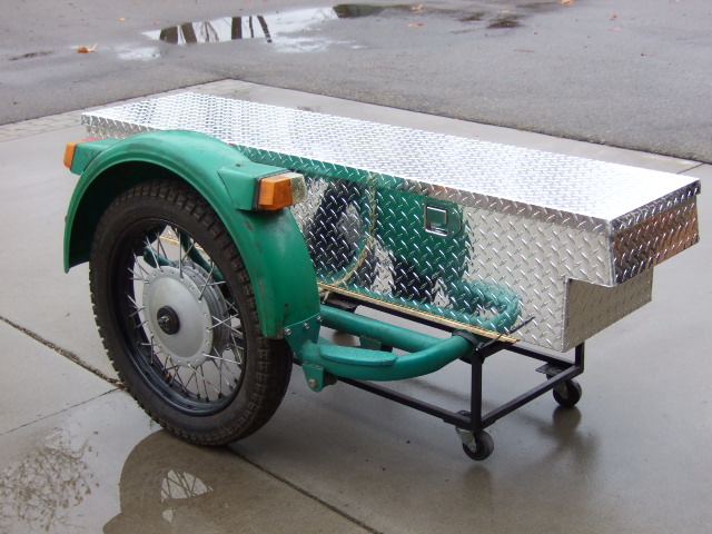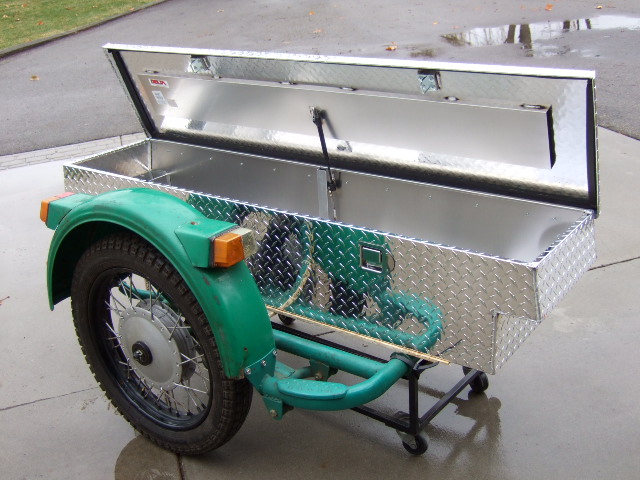 A URAL Classic sidecar with a new aluminum workbox body. Ready to go, with a new tire, running lights and wiring harness.