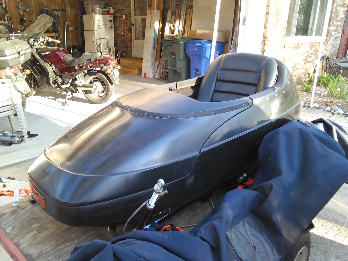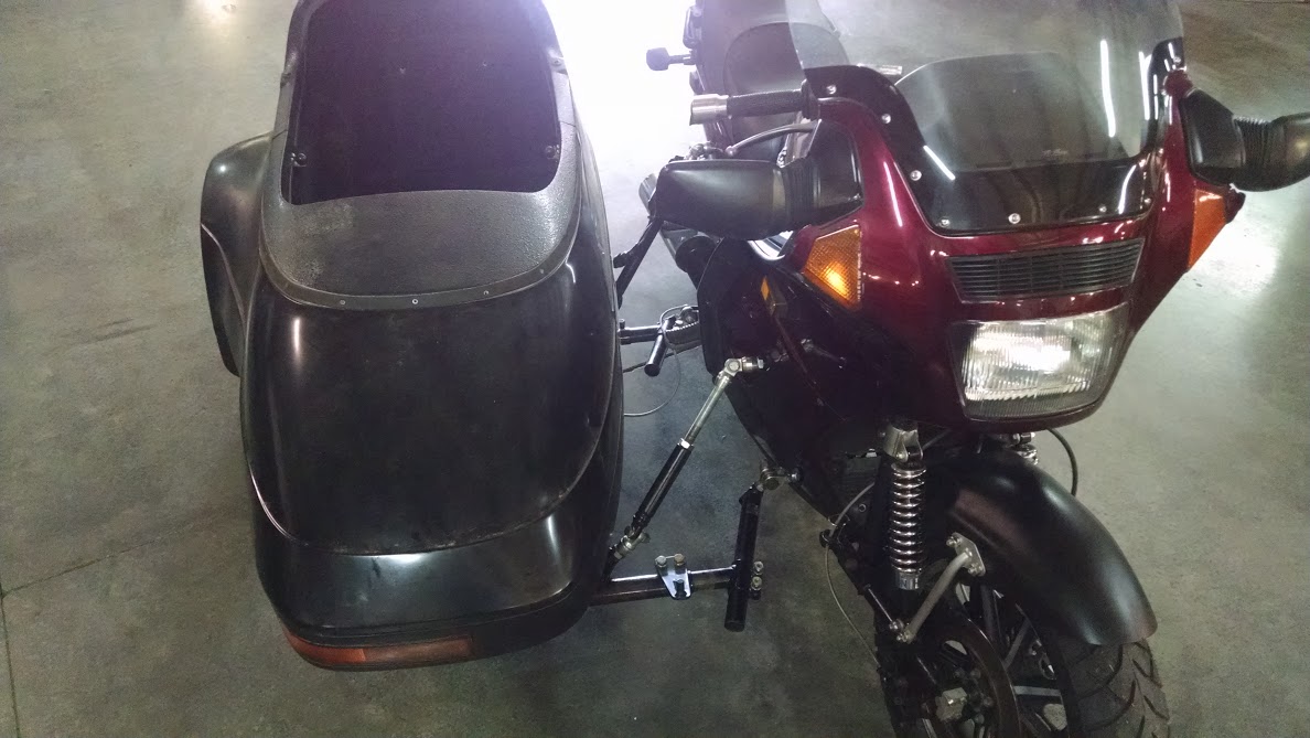 I picked up the rig yesterday from Doug at A Wing And A Chair, and rode it home. to say I'm excited is an understatement. I didn't get 50 feet on the rig before I started smiling. I was concerned how much the leading link setup would help since the clip ons for the Concours were a bit narrow. it works great! this thing is a JOY to drive and corners really well. in a couple weeks I'm taking it to a friend in TN and we're gonna put some color on the sidecar. it's going to be great!
