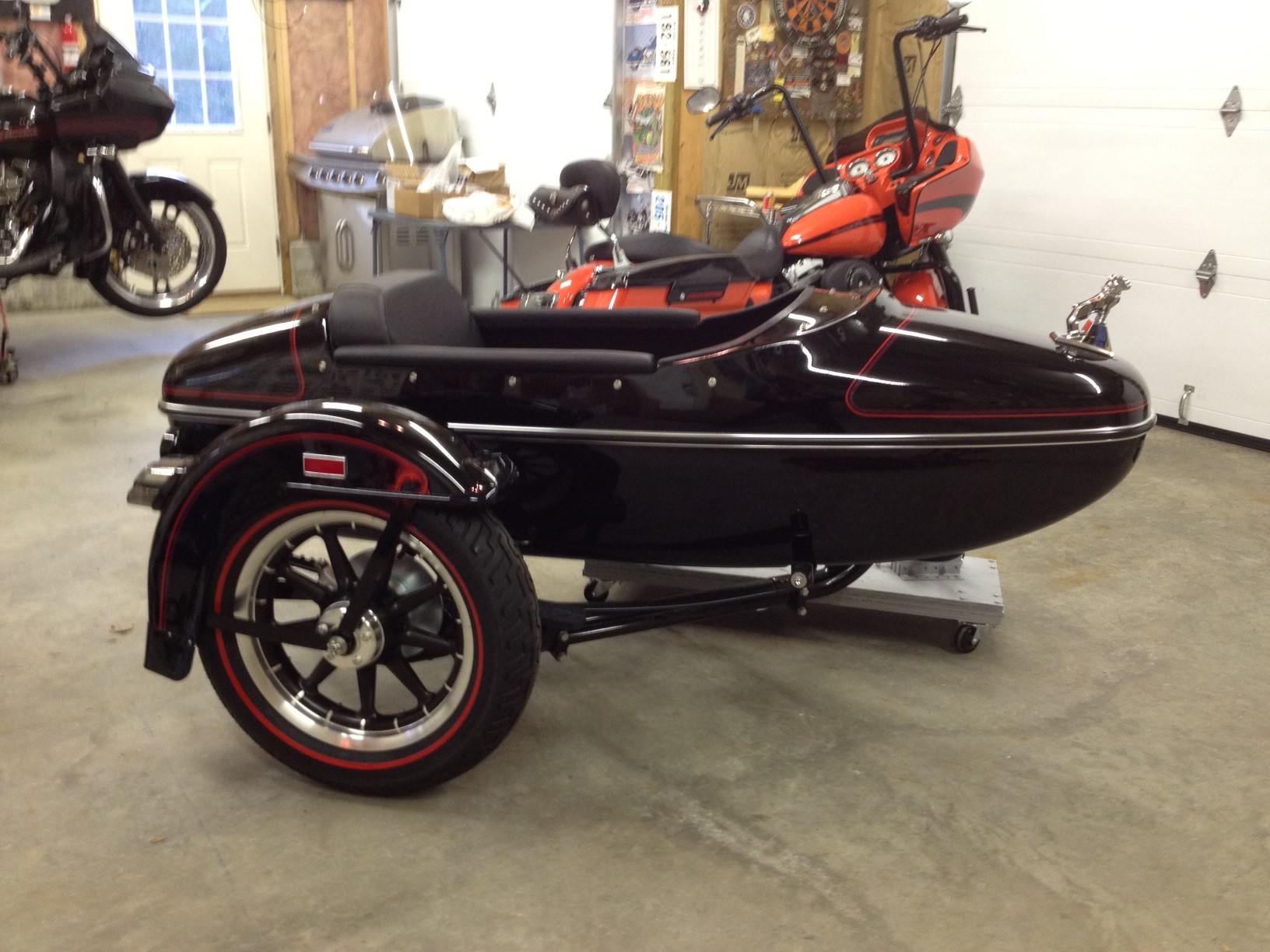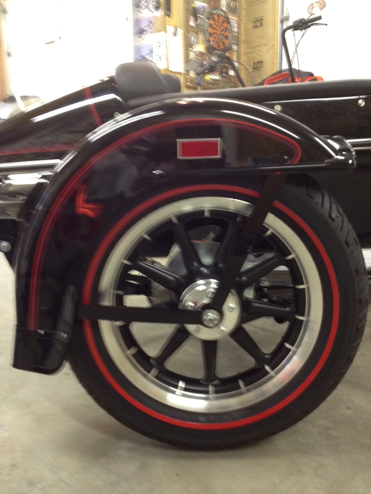 The car I just bought was to stock to get hooked to my bike and the stripes were the wrong colors. 10 bucks worth of 3M pinstripping tapes took care of the color change. Also had to much chrome for my tastes on the fender which I painted black and shot with a couple coats of clear. Smoked lenses and LED lights matched it to my bike better. Not a fan of whitewalls so a little tube of tire paint turned it red. A much more modern looking car