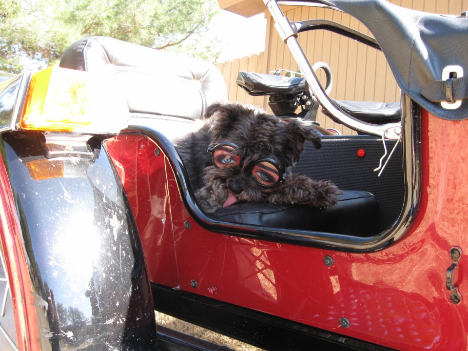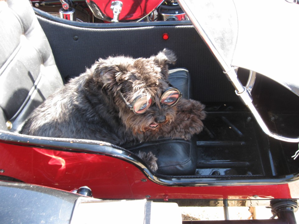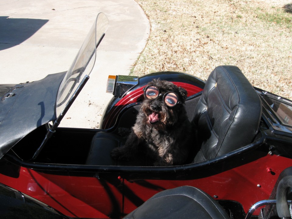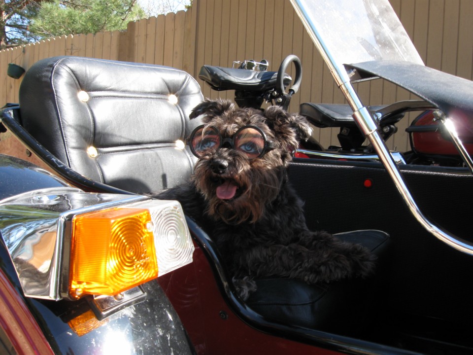 Maddie is adapting well to riding in the sidecar as shown in the attached photo. She's OK with the doggles as long as we're moving.