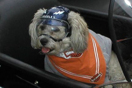 Ya, that is where we got the helmet. Persis is a Boston Terrier or Terror depending on the day. She didn't like the wind in her ears so the helmet offers some protection from that. Hopefully she will never really NEED the helmet for protection from the road. The doggles were recommended by the vet as Boston's have big buggy eyes that are easily damaged. She loves to ride.