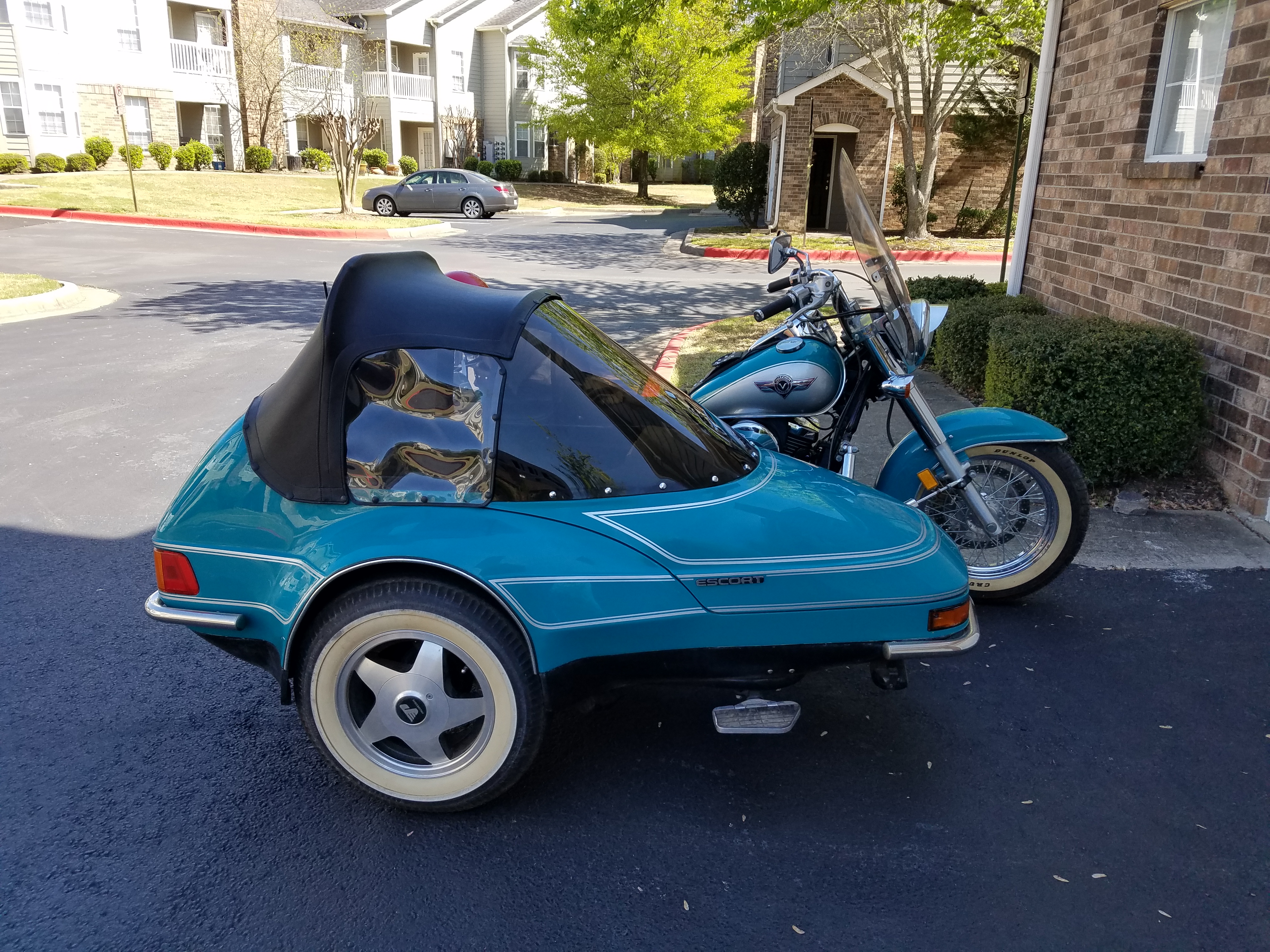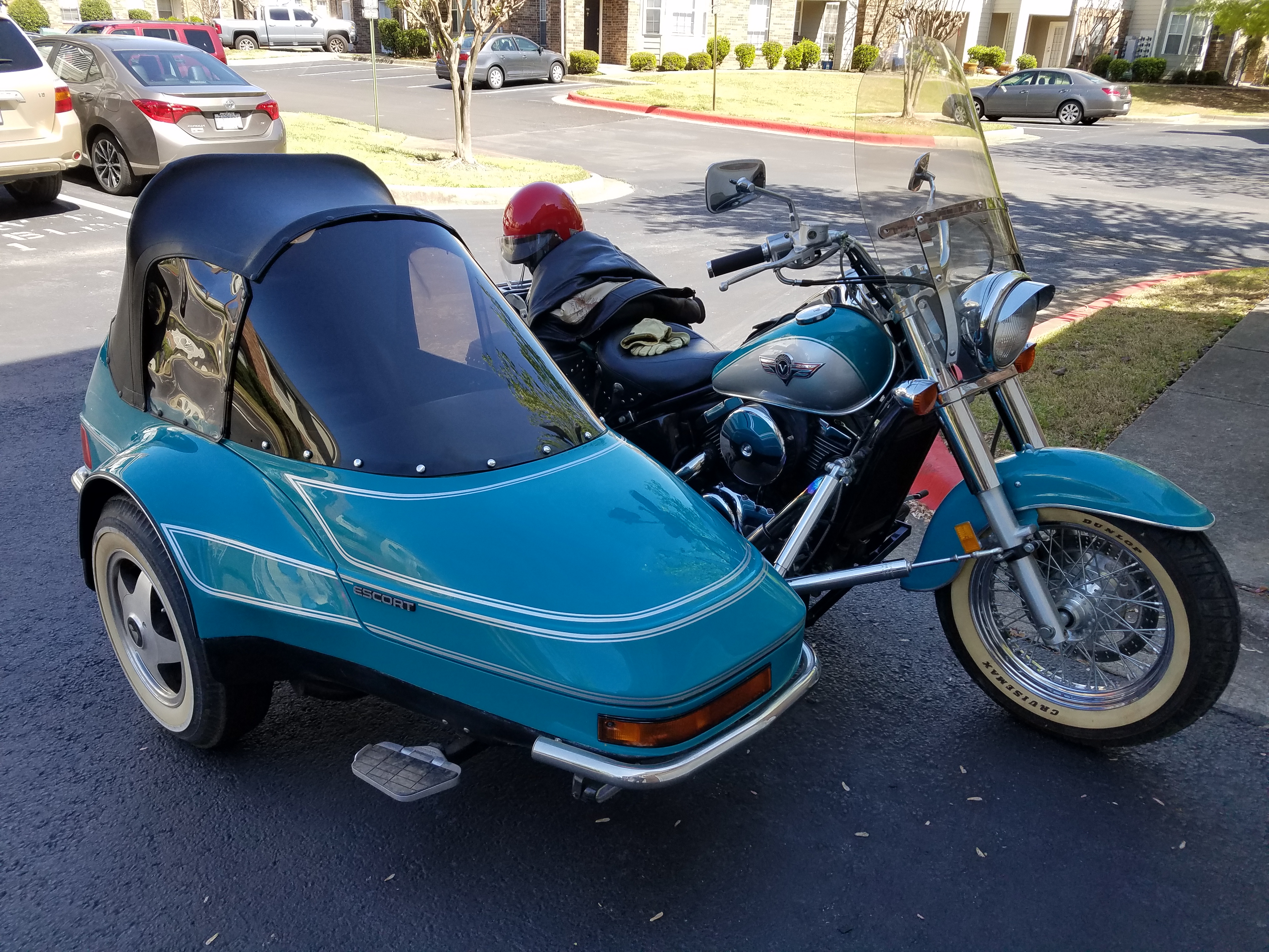 Finally got me a full rig. The last few months have been a roller coaster ride after getting into my head I wanted to get in to the world of sidecarist. First I thought I had the extra cash to put a rig on my Harley. Picked up 1979 Velorex cheap to restore. But the IRS had other plans for my extra cash. Then the State taxman decided he needed more from me then I planned and I had to part with my Harley to pay him. But low and behold I had some cash left over from selling my Harley and I find someone who had a complete rig and they too needed cash to pay the taxman. To get the cash they decided to sell their Kawasaki/Champion Escort rig. So now I am a proud owner of a low mileage yet older Vulcan 800 classic with a Champion factory installed Escort. Only issue is a faulty petcock from setting in storage too long.