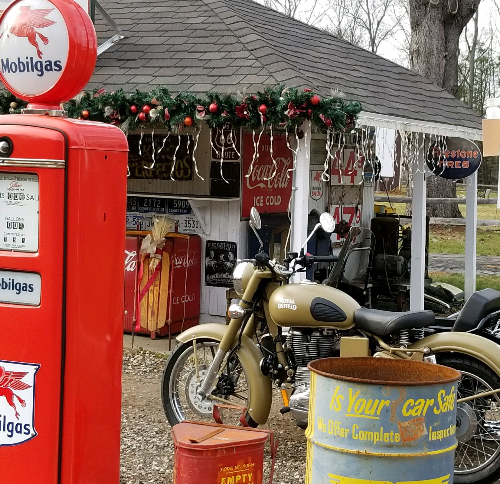 Along the route that we chose to take, there is an antique gas station, with old fashioned pumps, and a service building made to look like a 1930’s replica. I had said that I intended to stop there, and park the bike by the tanks, and take a picture. (See attached)
