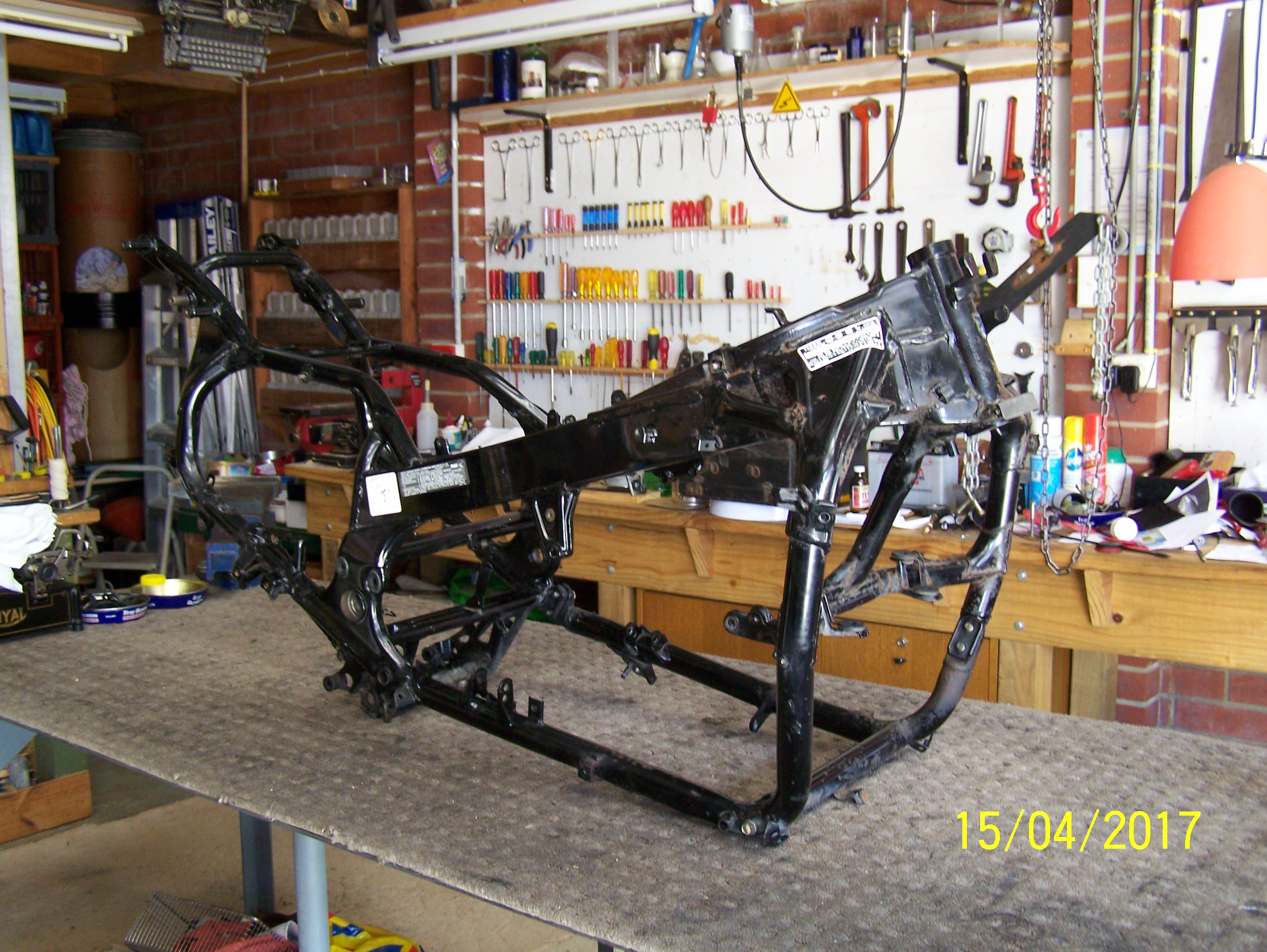The milk-crate stand is only a temp one to keep her at working height and out of my way, I have a bigger workbench which I hoist up my bikes when I work on them.