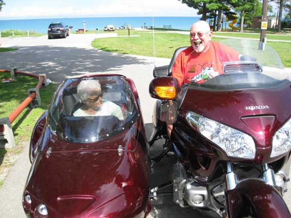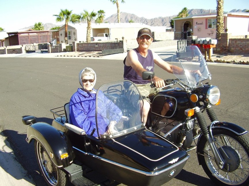 Here's our granny, age 84 on her first sidecar ride...she used to drive a BMW in Germany in 1940..it got left behind when they were forced out by the Russians...too bad.