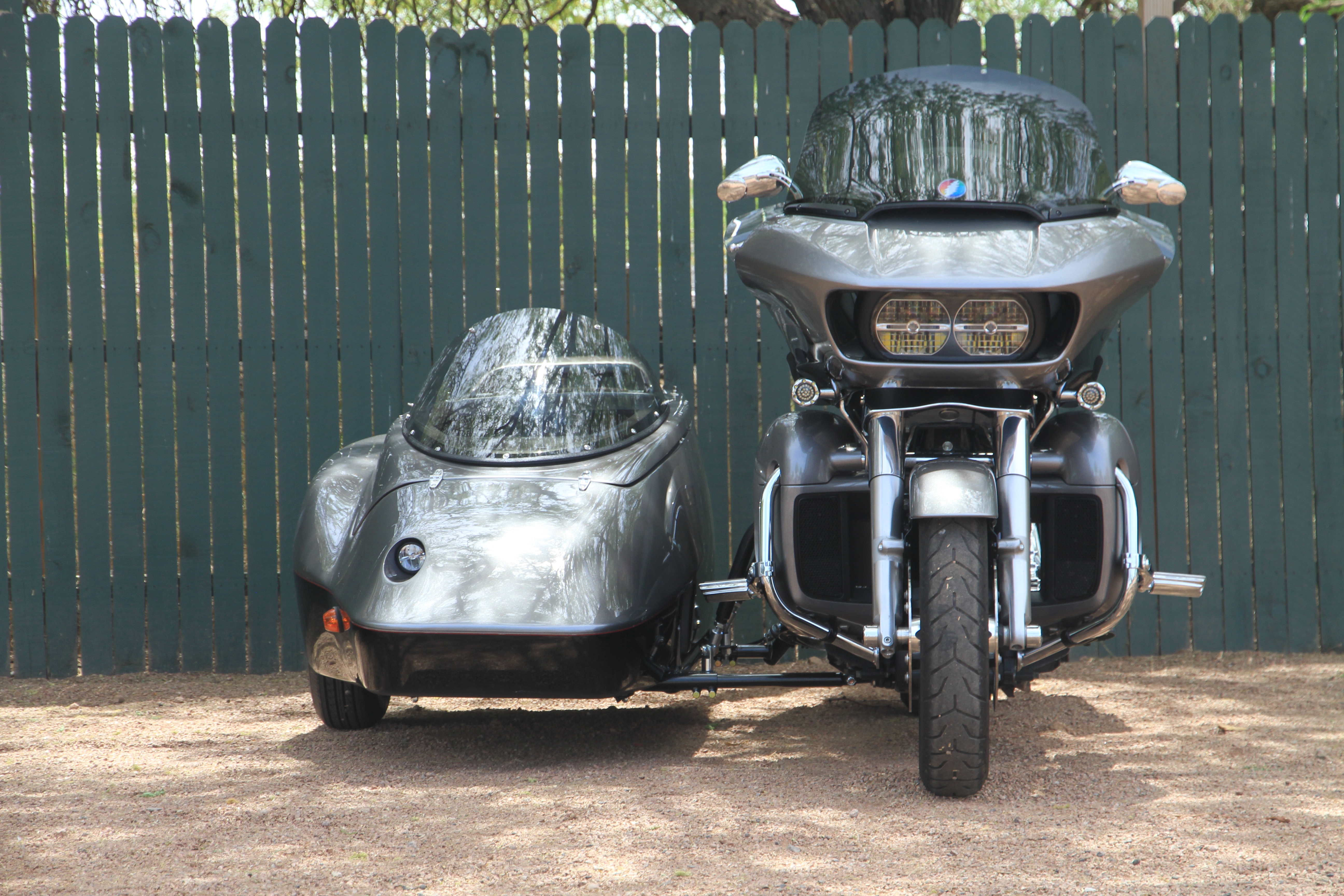 The hack is a Hannigan Supersport. Hannigan did a great job of color-matching the silver and black sidecar paint to the bike.