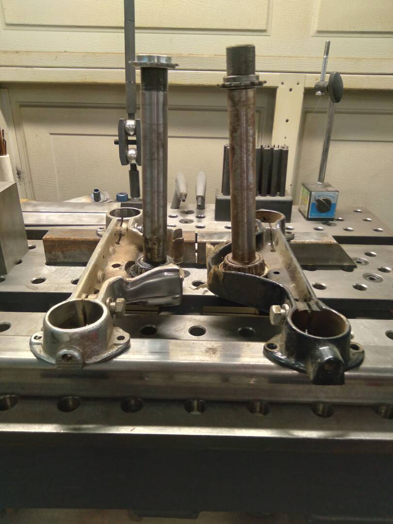 Posted by: @not-bobThe trees are much different between the 69' and the 97'. On the left is the standard lower tree from my 72' FLH (not the adjustable tree fitted to side car bikes) the fork is forward of the stem, no rake in the stem, and the frame had 30 Degrees of rake. Thus the need for adjustable trees and a damper for chassis tuning. When elevated for a steering head adjustment, the natural position of the wheel is full lock to either side.