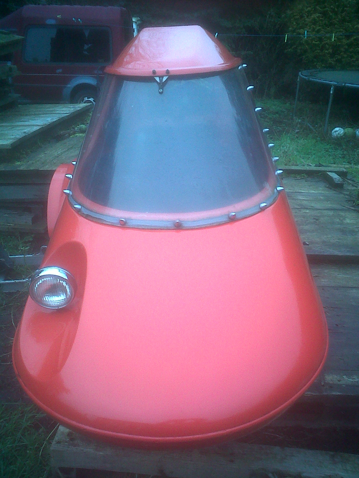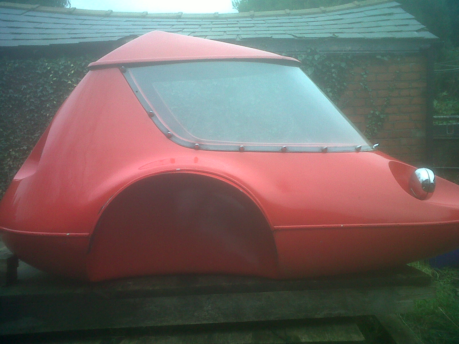 I remember that sidecar type in the mid 1970's. It was manufactured in or around the LA area and I've seen pictures of a few from back then. My Dad took pictures of one in the Oakland California in a used car lot around 1977 or 78. It was the same one that you have and it used a 12" trailer wheel and was mounted to some Japanese bike. If you need information on how to make a frame that would fit that body send me an email and I can help you out. If you or a friend can weld I can walk you through the steps; it's easier than you might think.
