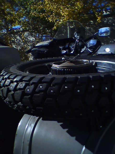 I do indeed ride in the snow. Everyone I talk to thinks I'm crazy. I live in a winter resort and I simply ask them if they ski or snow mobile. You can see the light bulb go on in their eyes. "Oh, yeah, I get it" is the usual response. Any way, I don't have swing arm clearance for chains so I am limited to studs. While they are an improvement, you still have to be extra careful. There is trouble at every intersection. I can't count the number of people who drive without scraping the frost from their windshield.
