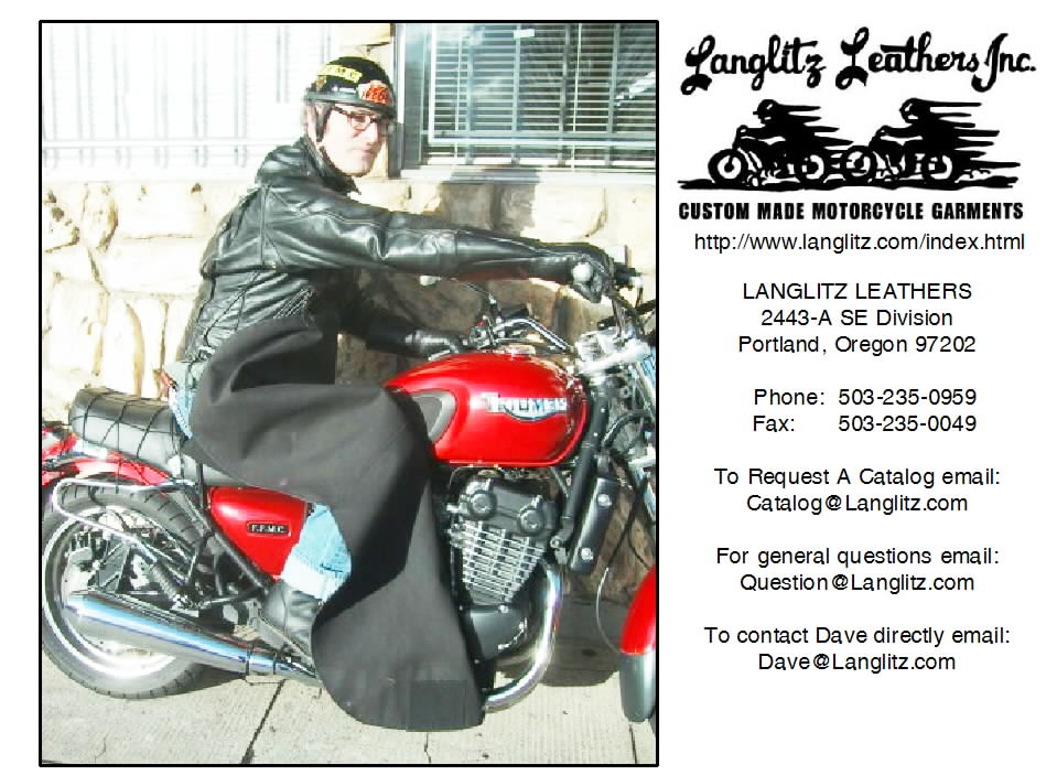 I sent a email to Langlitz today and got a reply, I was really surprised, Langlitz has been around a very long time so they must be doing something right, the old time lap robes were made of sheep skin with the wool inside, must have weighed a ton. I live in the sticks at a 2000' elev and travel 50 mi to work, it will be cold as heck here but 20 or more deg's warmer at my destination, I've got warm pants but there a hassle and I don't have any place to store them so a lap robe would be nice,,,if it will work on my bike, hopefully it will but there might be some ex. pipe issues on my Shadow 1100T Classic.