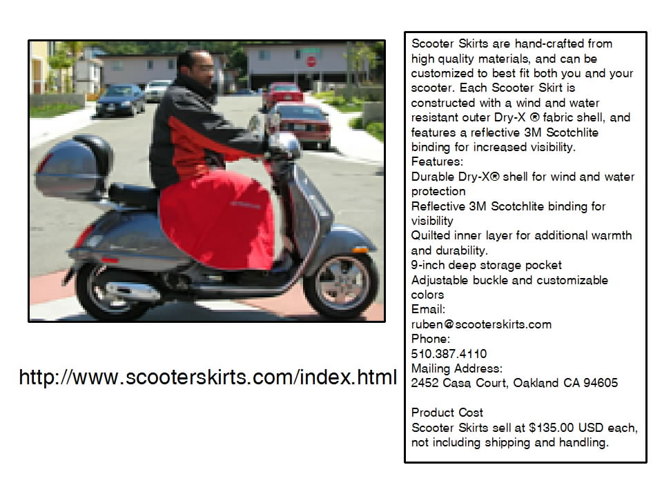 Scooter Skirts: May or may not work ok. Looks a bit cheap.