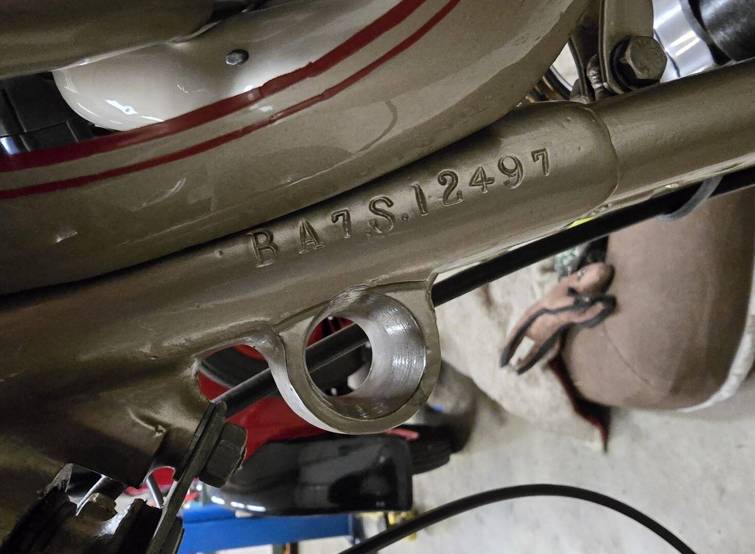 I have spied, with my eyes....a second sidecar mounting boss on the frame of this 1954 BSA A10 Golden Flash, and this second sidecar mounting boss on the frame is for theΒ rear upper mounting strut.
