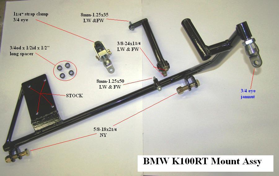 We make a mounting kit for the K100 that gives you all 4 mounting points, We also make a leading link front end for this bike. The mounting kit replaces the center stand and attaches to the engine as well as the upper crash bar mount.