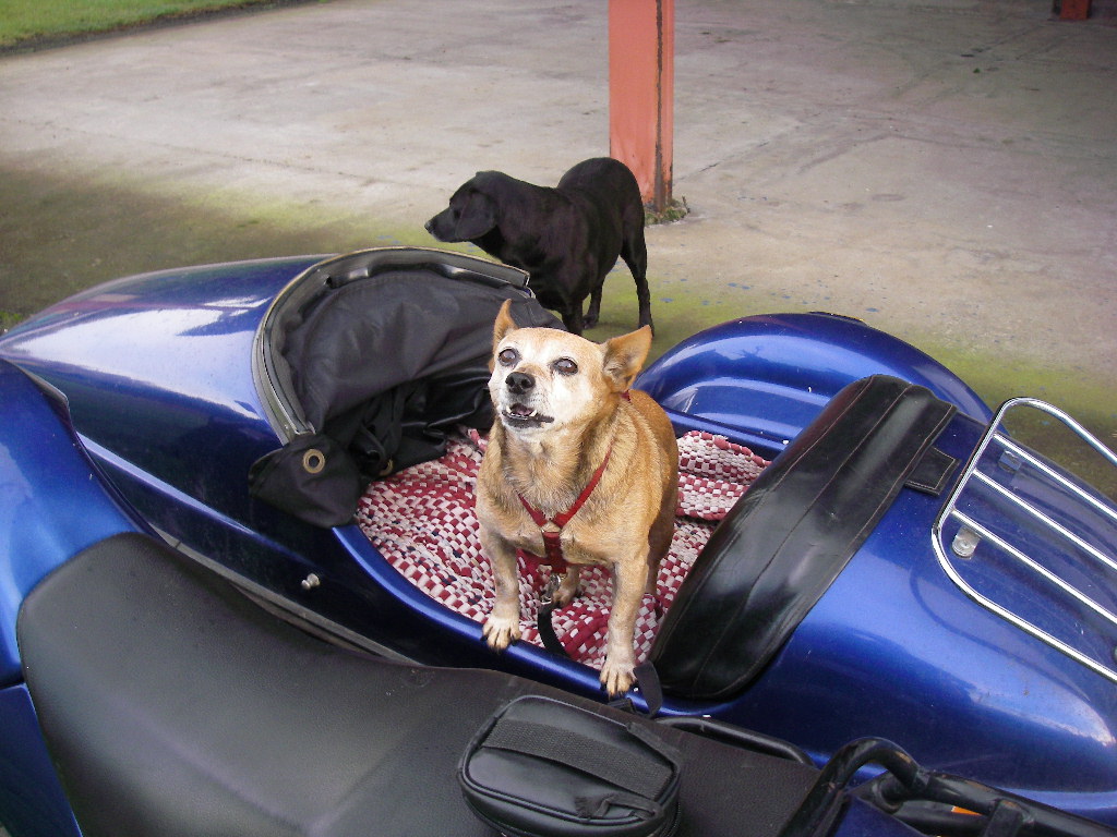 Looks like the dogs are going to take right to riding. Just have to be sure the big one doesn't jump out every time he sees a little squirrel, and the little doesn't jump out every time he sees a big dog. If a big dog had the spirit of most of the little Chihuahua's I've known, they'd rule the pack ... maybe the world.