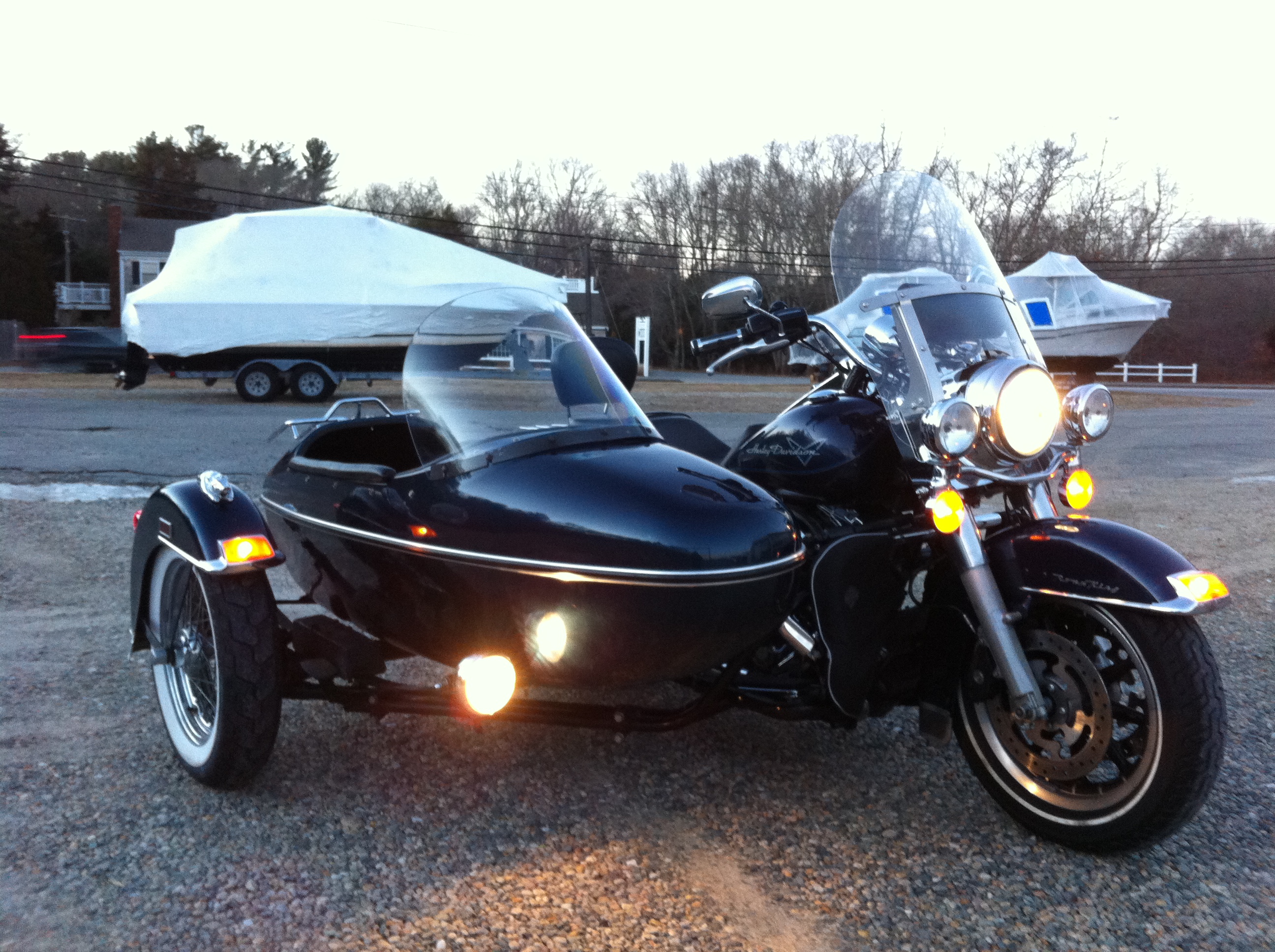 Her's a picture (ihope it posted) of my rig, 2008 Road King with a 2000 TLE hack. BIke is dark blue pearl, car luxury blue but they are very close. Have driven it twice, handles pretty well, but has a slight pull to the right. I'm going to fine tune it, lean the bike out a bit and it should be good to go. Just wish we had some warmer temps !