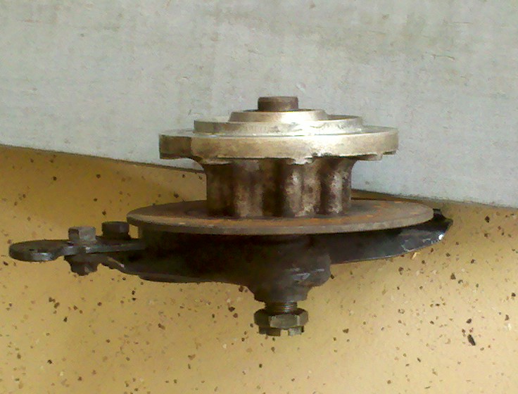 About a month ago I posted a request for suggestions on what to look for on a K100/EML rig that I was considering purchasing. This was to be a trade for an R1150GS that I owned but wasn't using very much. Well I did get the rig + a bunch of cash in exchange for my GS. Overall the unit is in good condition. A bunch of cosmetic things to be sorted out, a rebuild of the oil/water pump, it seeps a very small amount of antifreeze after sitting a couple of days, and replacement sidecar wheel bearings, very, very slight play but I'd rather be safe than sorry. I've ordered and am awaiting the parts to rebuild the pump and I've purchased the wheel bearings and seals. My current problem, and therefore my plea for suggestions, involve my difficulty in removing the sidecar wheel axle. I've removed the suspension part that contains the axle mount, wheel hub and brake disk but cannot free the axle from the casting. See attached photo. The axle is frozen in the casting. I assume that once the castle nut is loose/removed the axle should be free to slide out of the casting, but it does not. So far I've treated it over a couple of days with PB Blaster and tried mildly heating with a propane torch while applying light pressure with a puller. Of course I'm very limited to how much force I can apply with the puller because I'm pulling against the brake disk and don't want to damage it. So, before I do some serious damage I'm hoping someone can make a suggestion or two that might help resolve this problem.