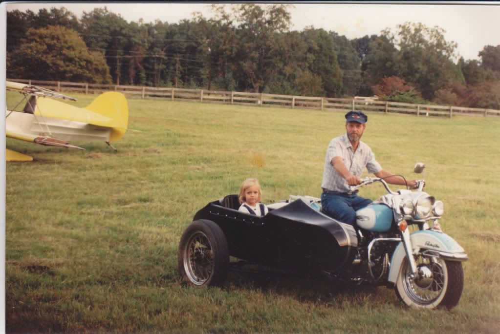 e and Ken climbed into the sidecar and off they went. After a few trips up and down the driveway and a few turns around the center circle in front of the house Bill was looking good. Ken got out of the sidecar and Bill shut the bike off and got off. He then asked Lynn if she would like to take a ride. As she ran over to Daddy so that he could lift her into the sidecar I asked if I could take a picture. The little one “pitched a fit” as they say in the South. She started crying not wanting me to take her picture. My wife walked over and had a little talk with her wiping the tears from her eyes and everything was OK, my wife would take the picture. Bill fired up the rig and off they went Daddy and the little one riding in Dad’s sidecar just like he had been dreaming about. When Bill pulled back up to the garage he shut off the rig and said “Johnny you made my dream come true, thanks”. We loaded up Bill’s rig onto his car trailer and he placed Lynn into her car seat. Before they drove out threw the gate Lynn was asleep.