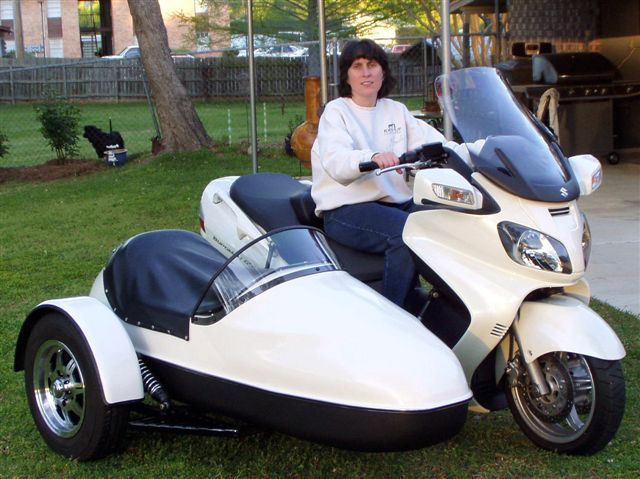 We have finaly assembled and aligned, and re-aligned, Jena's new rig, a 2006 Burgman AN650 with Texas Ranger sidecar. The rig is well balanced and quite easy to drive with the CVTransmission.
