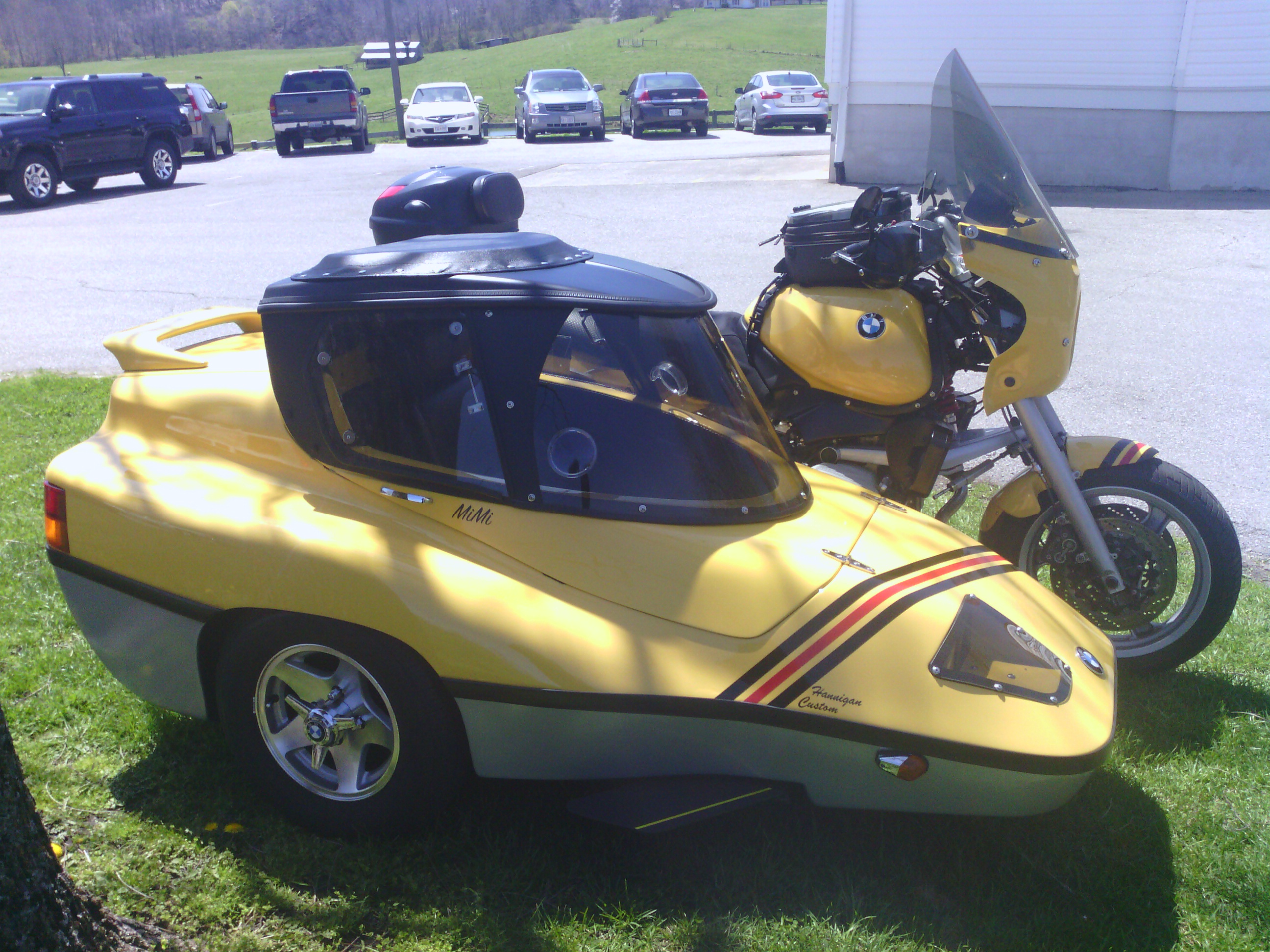 It started last October when I drove from VA to MI on a weekend to purchase a Hannigan Astro that I thought was a good buy. At the time the only solo bike I had was a BMW 08 K12GT. After some figuring and investigation I realized this was not going to be a good tug for such a big chair. While on my 8 day 3700mi trip last summer I realized I missed my rig and my long distance two wheel touring may be coming to a close. About a month later I ran across a 99 BMW K12LT with only 4200mi. I was able to make a trade for my GT and the build began. I set about sourcing mounts. steering mods, tires etc. Had the chair painted to match the bike. I just finished and put it on the road Friday! 🙂