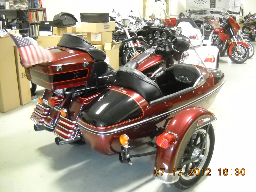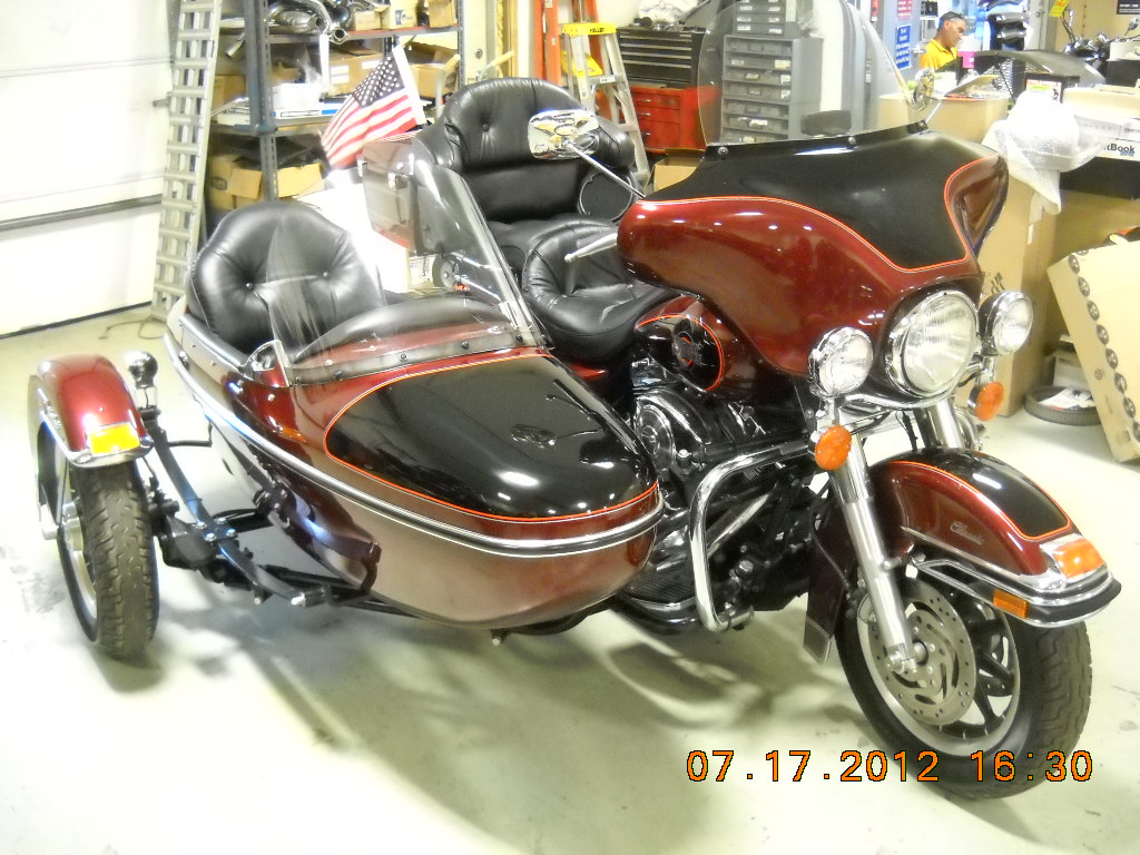 I picked up a slightly used 06 Ultraclassic with matching Ultra Sidecar today. My wife says I am a brand whore, but man is it cool. What a difference from my CSM rig, I have to learn all over again since it feels like the Harley rig will fly with no effort and my CSM hardly ever came off the ground. I put my 100Lbs of ballast behind the seat for safety and need some parking lot time. I will post pics later but need to know if it is normal for it to pull to the right to the point where I fill like I need to have constant pressure to keep it straight. No wollbles and it is super easy to steer so I assume there has been a steering mod done.