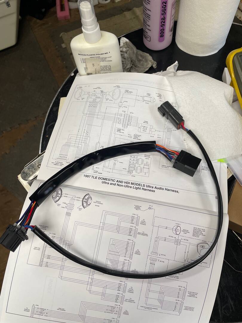 All bike side work completed. All lights functional. I had to make several electrical harnesses, here's the one that adapts to the existing bike harness to break out the turn lamp, park and tail lamps, and the brake lamp. These things are obsolete from the motor company, and thin to non-existent on the ground, so DIY...