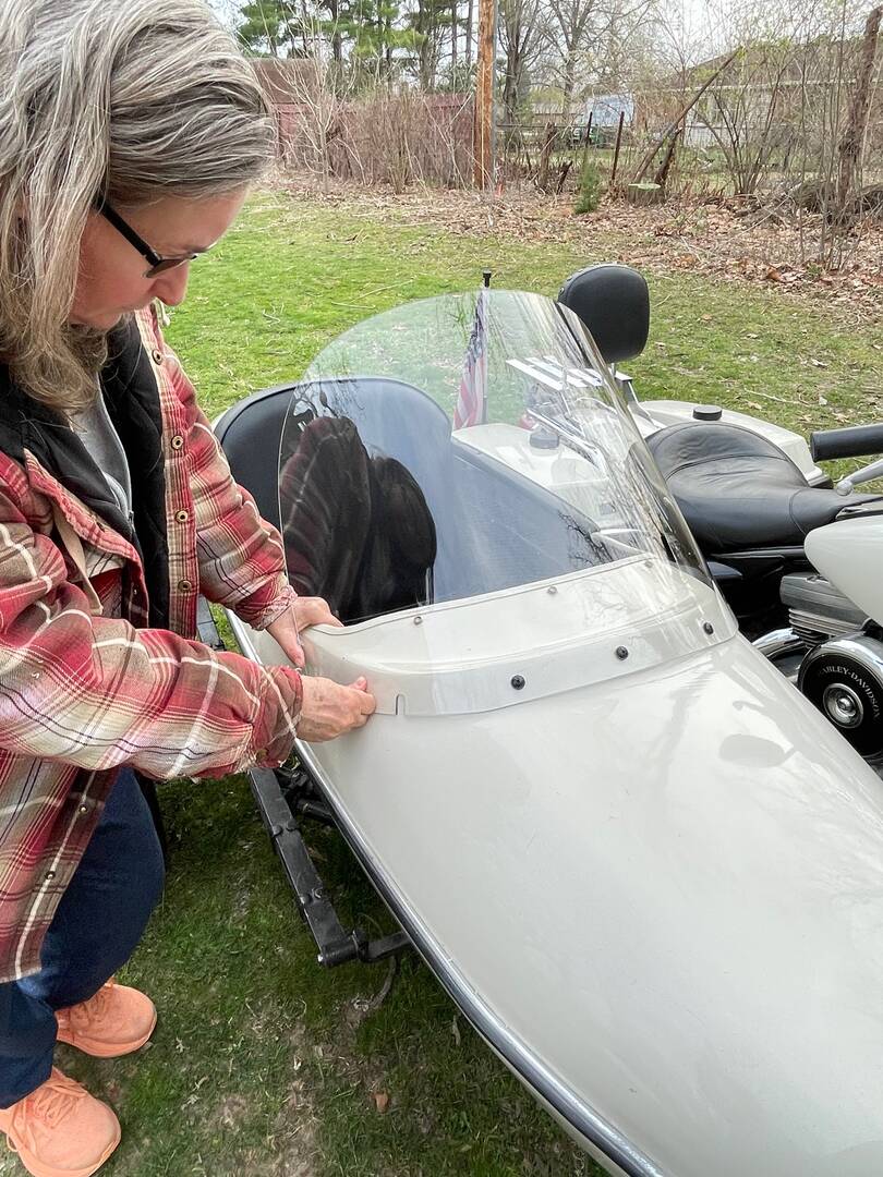 Windshield done. Mrs. lended a steady hand during the drilling 😀. This tub appeared to never have had a shield in the past. I think I should have installed the black foam tape to the inside of the shield rather than the sidecar tub... oh well...