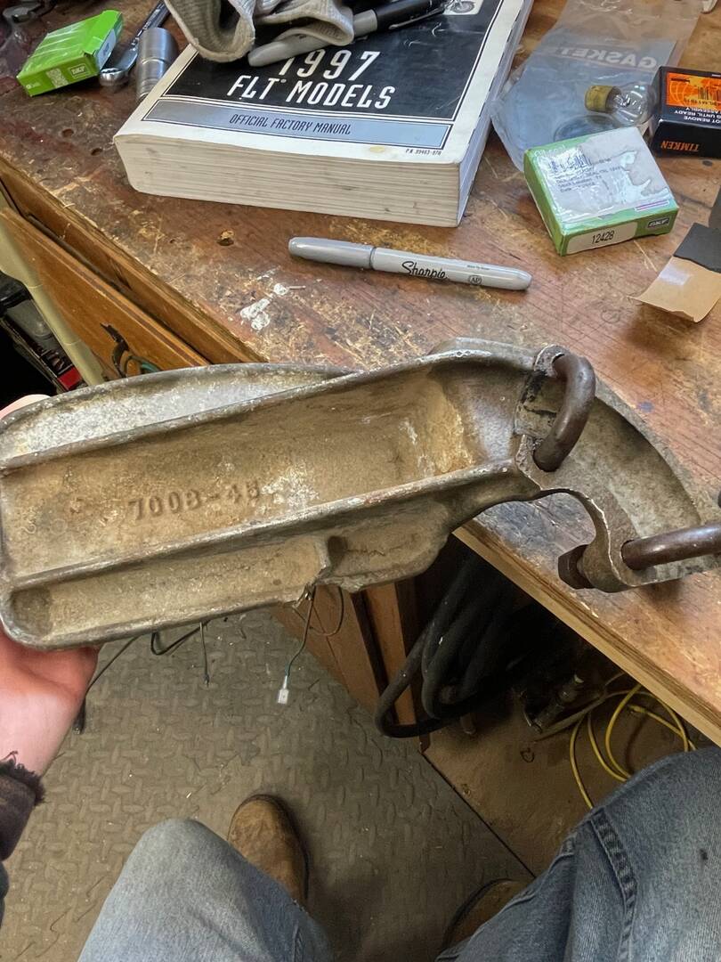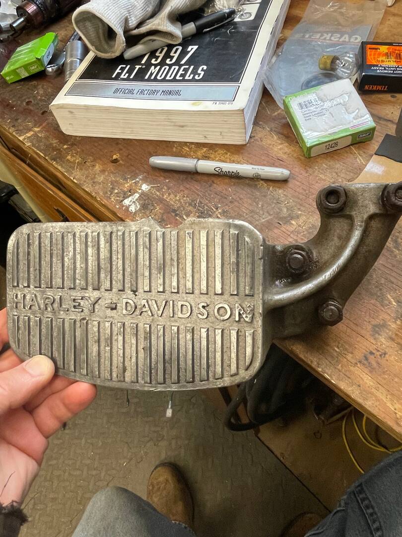The tab that fastened to the fender was broken off. Doesn't affect my needs. The last two casting numbers on the bottom indicate Harley first made these in the year 1945 I believe. I guess these steps were used on Knuckleheads for a few years too.