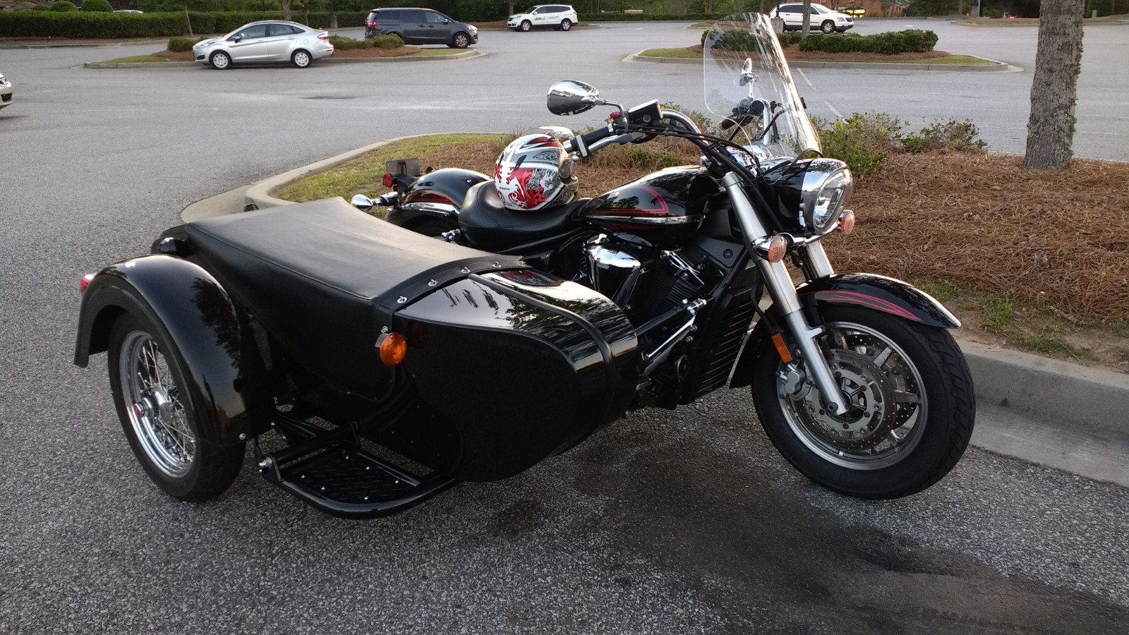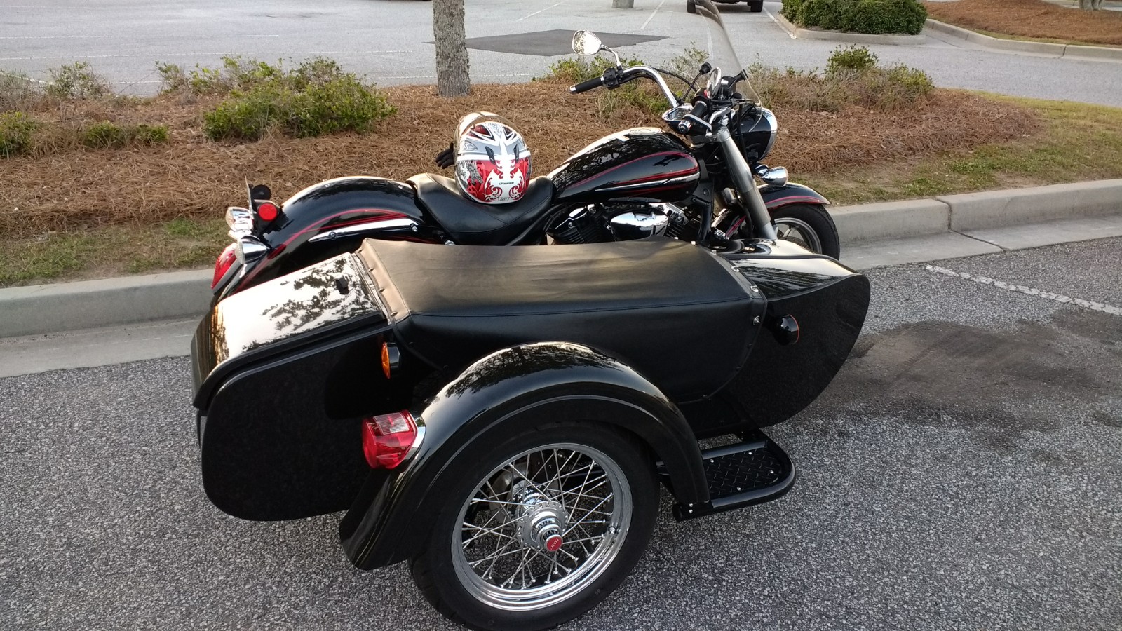 Hello everyone. I recently joined the USCA forum and I am new to the world of sidecar rigs. My wife and I became interested in a sidecar set up after taking a sidecar tour during a vacation in Eastern Canada. We enjoyed riding around with our tour guides so much that the same day we decided to get a sidecar rig. I first looked at Urals and even test drove a few and although good looking rigs, I always wanted something different. It took over a year of searching for the bike and the sidecar but it has finally come together. The rig is cruiser based using a Yamaha Vstar 1300 and a DMC M72C for the sidecar. The combination is very stout, the bike has plenty of power and the sidecar is very comfortable for my wife. The steering is a bit heavy and unfortunately triple trees are not made for this bike however it is not so bad that it would make me regret the rig choices. We are looking forward to many fun miles with it.