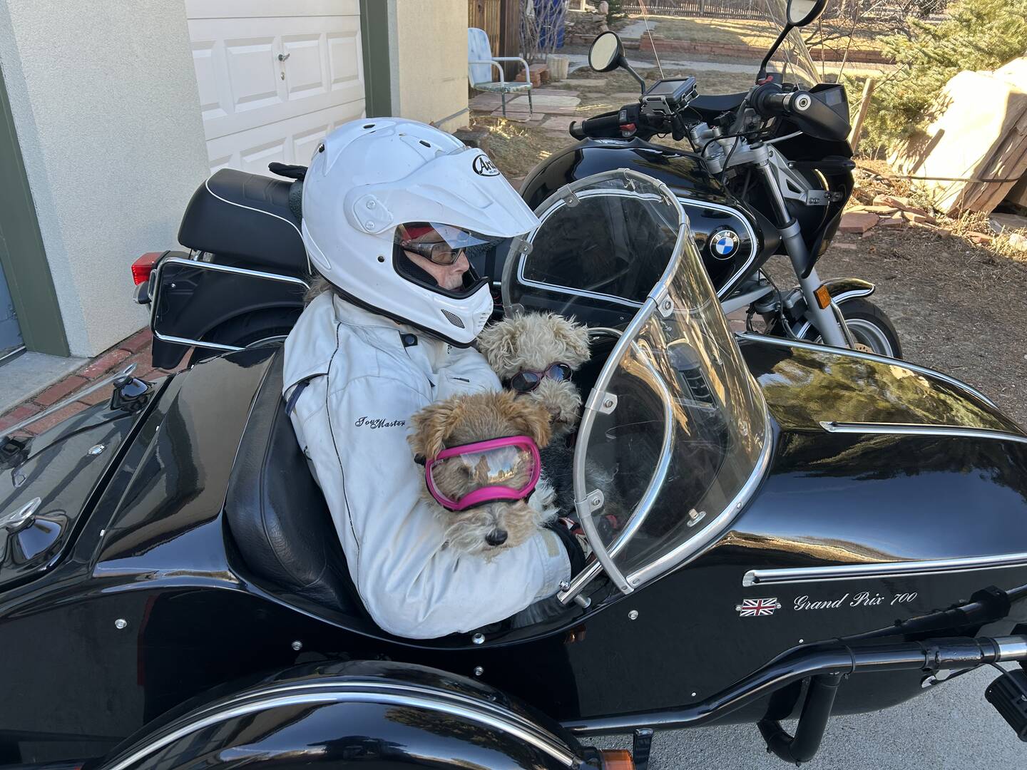 The windscreen frame of the sidecar scratched the heck out of the lens, and there are a few new scratches on the windscreen lexan. Will get a new lens for the Rex Specs, and try a ride without the windscreen. She likes looking around the screen, and we don't need to travel faster than 45mph. Hopefully that works. "Paws crossed."