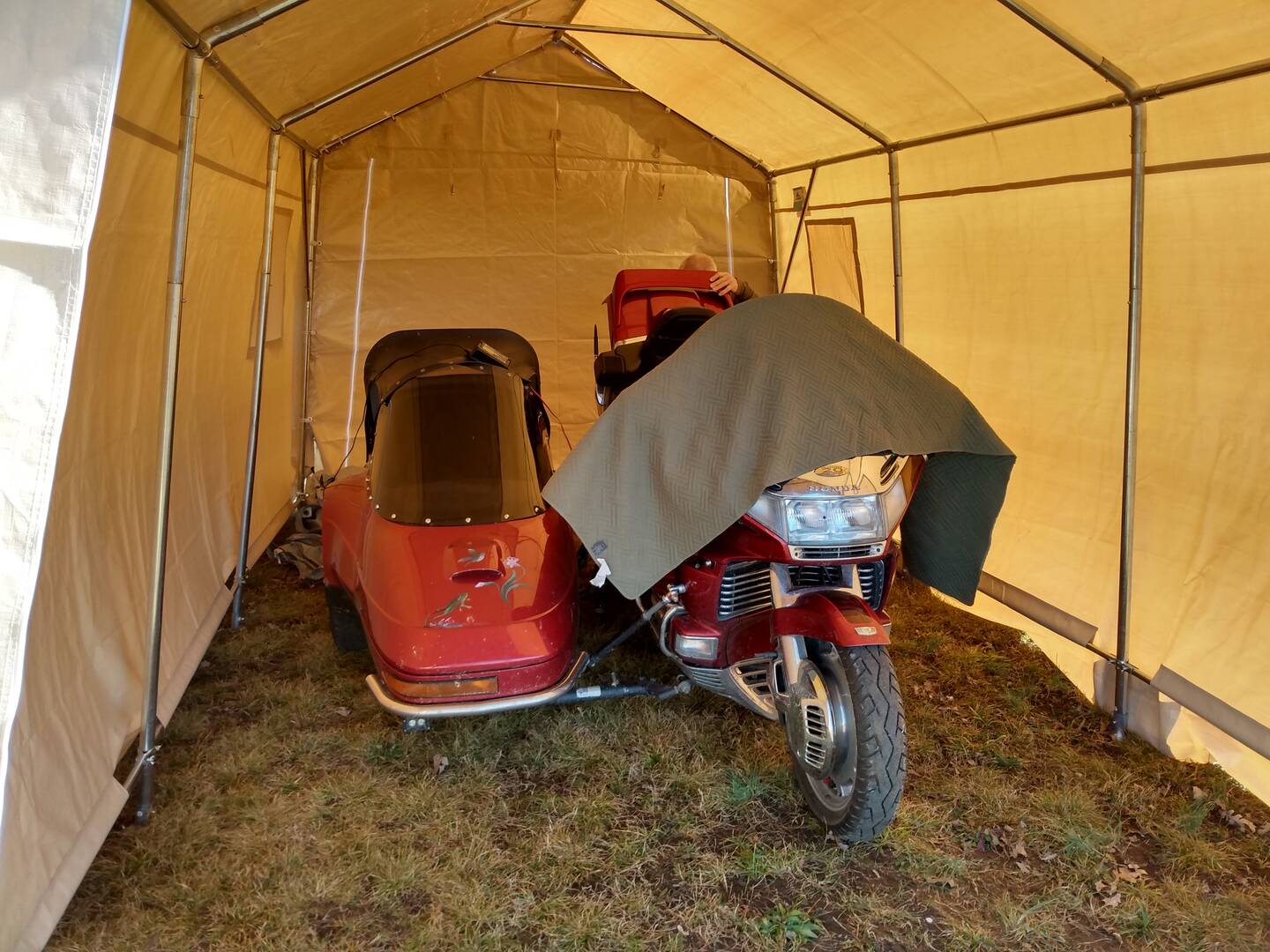 Today...we erect the secondary shelter for his original Sidecar rig, then need to spit-shine his newest Sidecar rig that I just delivered to him