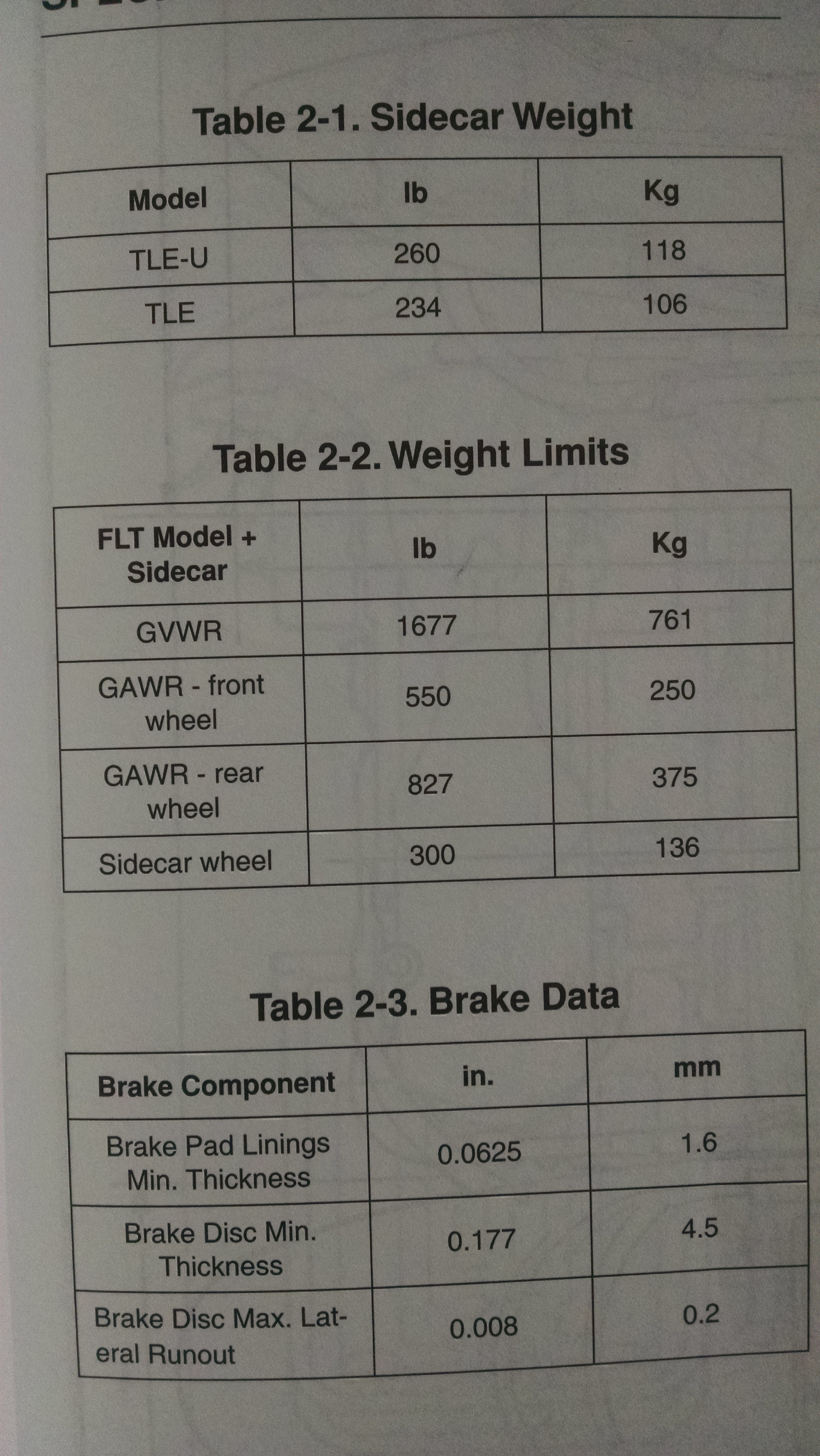 I'm not sure how helpful this will be, but I'll post these anyway. First is a page from the 2005 Harley sidecar service manual. The service manual only has this information, gross vehicle and axle weights, not specific load capacity for the sidecar. The second page is from an RLE sidecar owner's manual (the sidecar model they mounted to 1980's FXRT) That page gives you some general loading guidelines but the numbers won't be right for your combination. You can probably find a sidecar owner's manual on eBay that will give you the information for your bike's year.