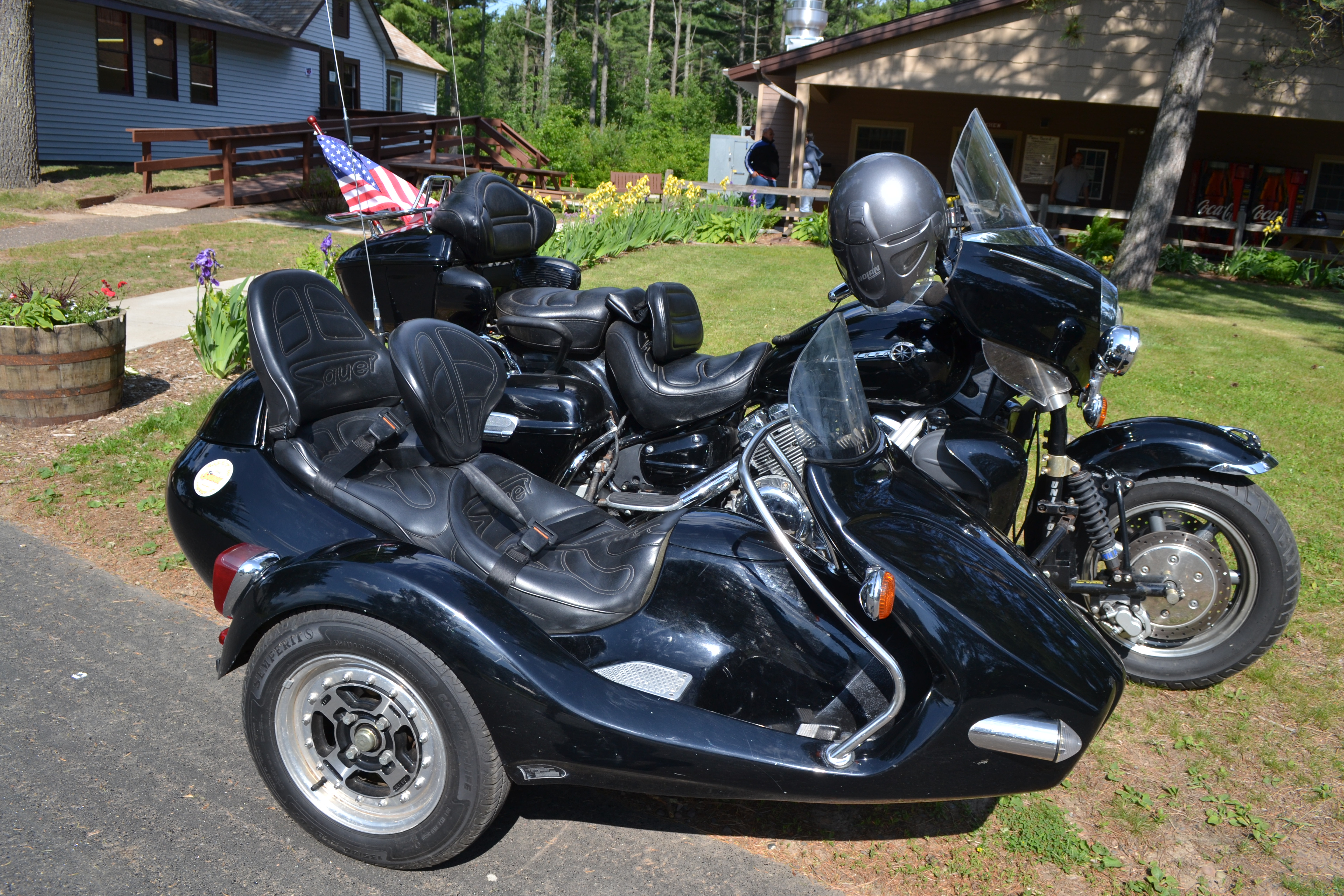 Hi there. The weather in Ft. Myers, fl. is wonderful this time of year. The sidecar in question is a "SonnenWind" mfg. by SAUER in Germany. Their website can be found by Googeling Sauer sidecars. I asked the U.S. distributor (Dauntless) about it and was told that to their knowledge there were none of these in the US. It has as much weather protection for the passenger as there is for the rider. It was designed for those who do like being "cooped up" and enjoy the open-air experience as much as the rider. If you look closely, you will notice lap belt for both the fore and aft passengers. These are factory installed, and a quick ride will convince you. The side-forces are as great or greater than riding pillion on a hacked bike. Great fun, though.