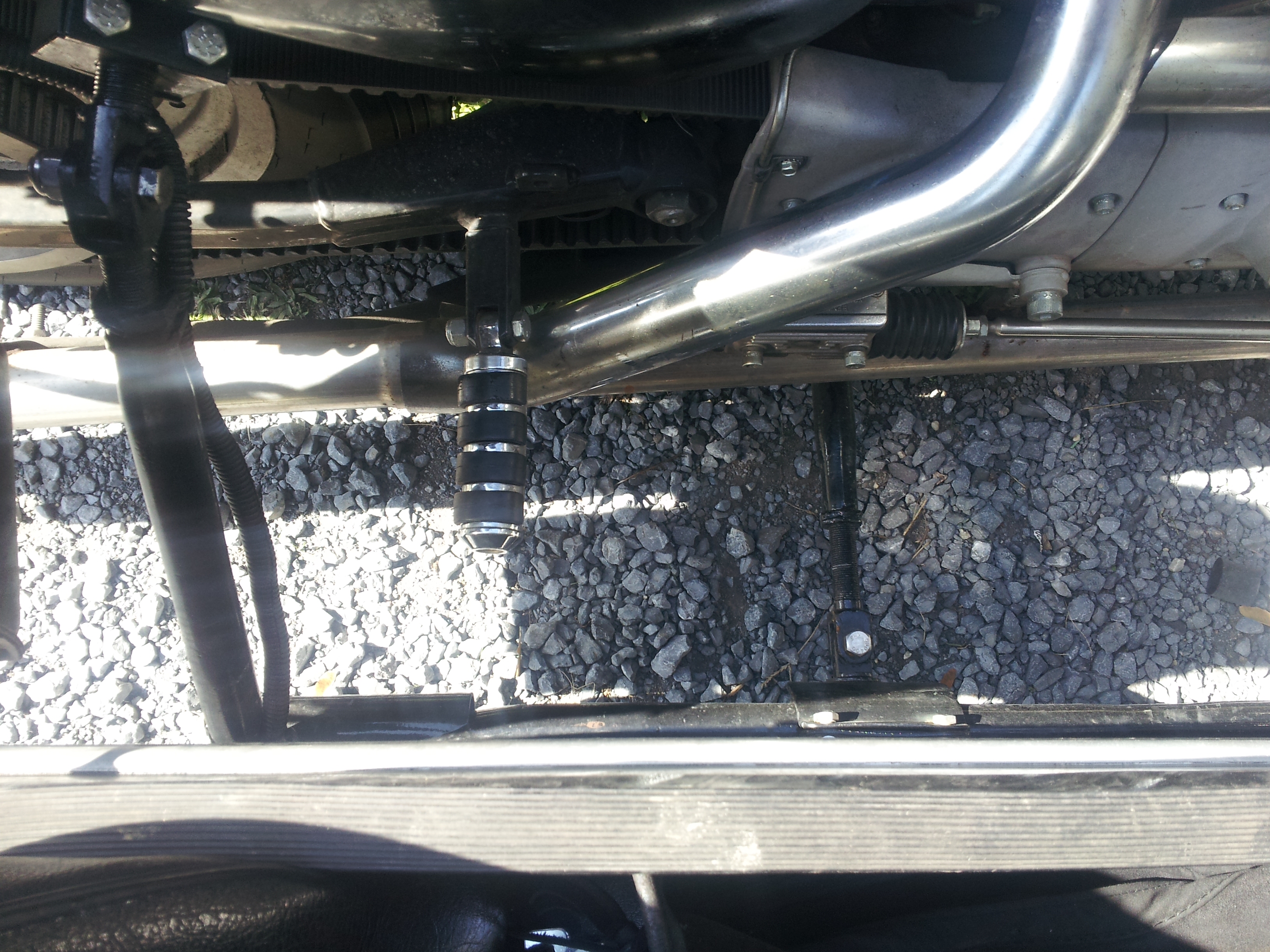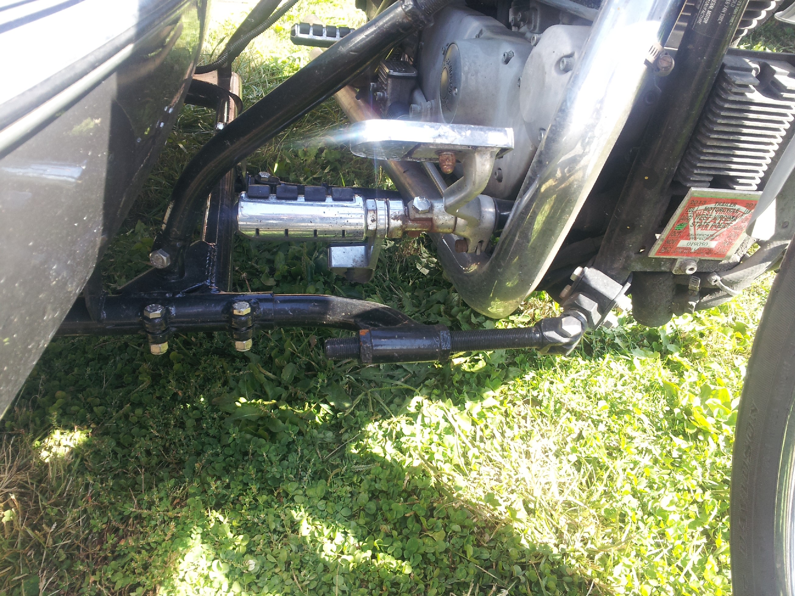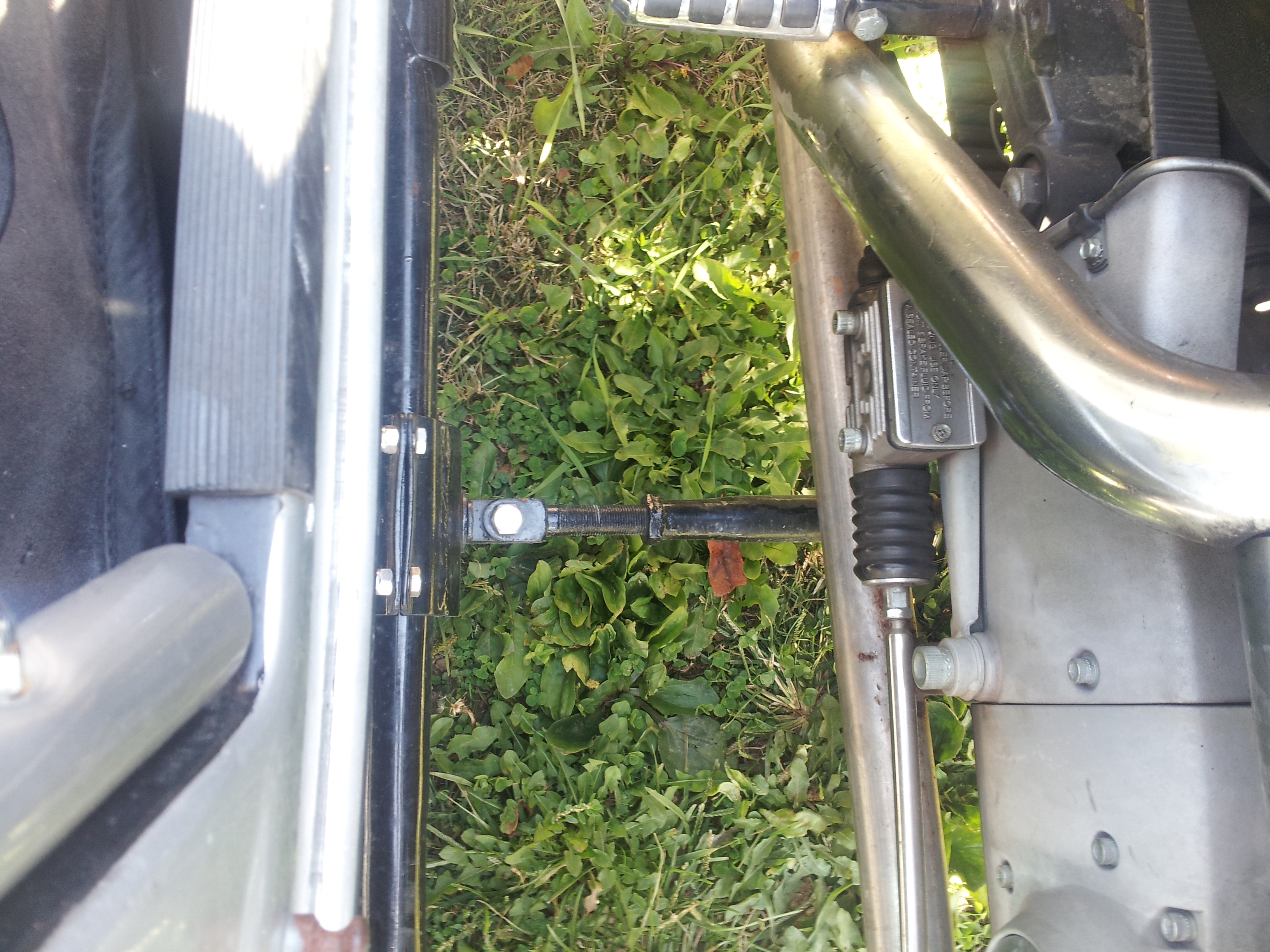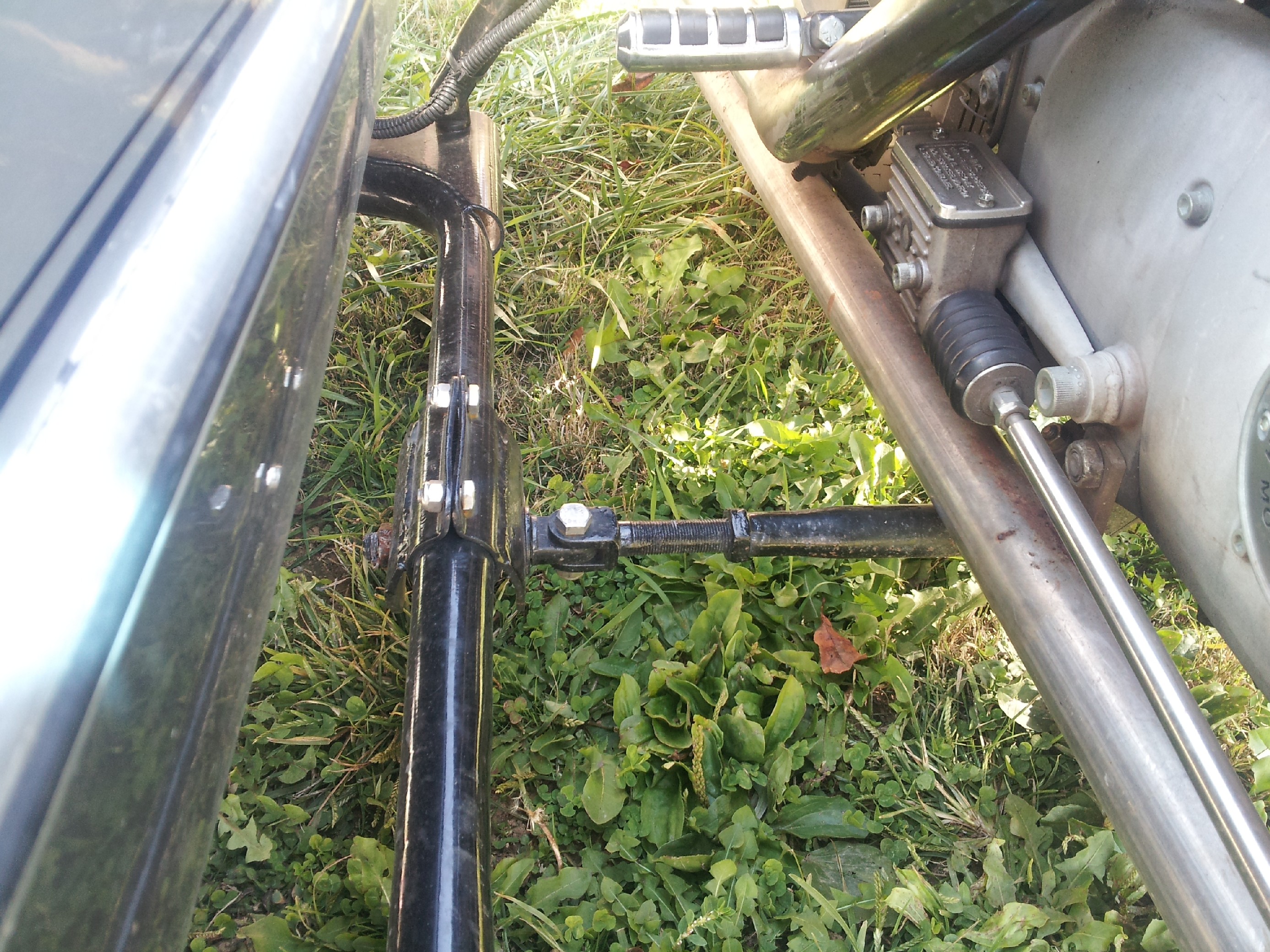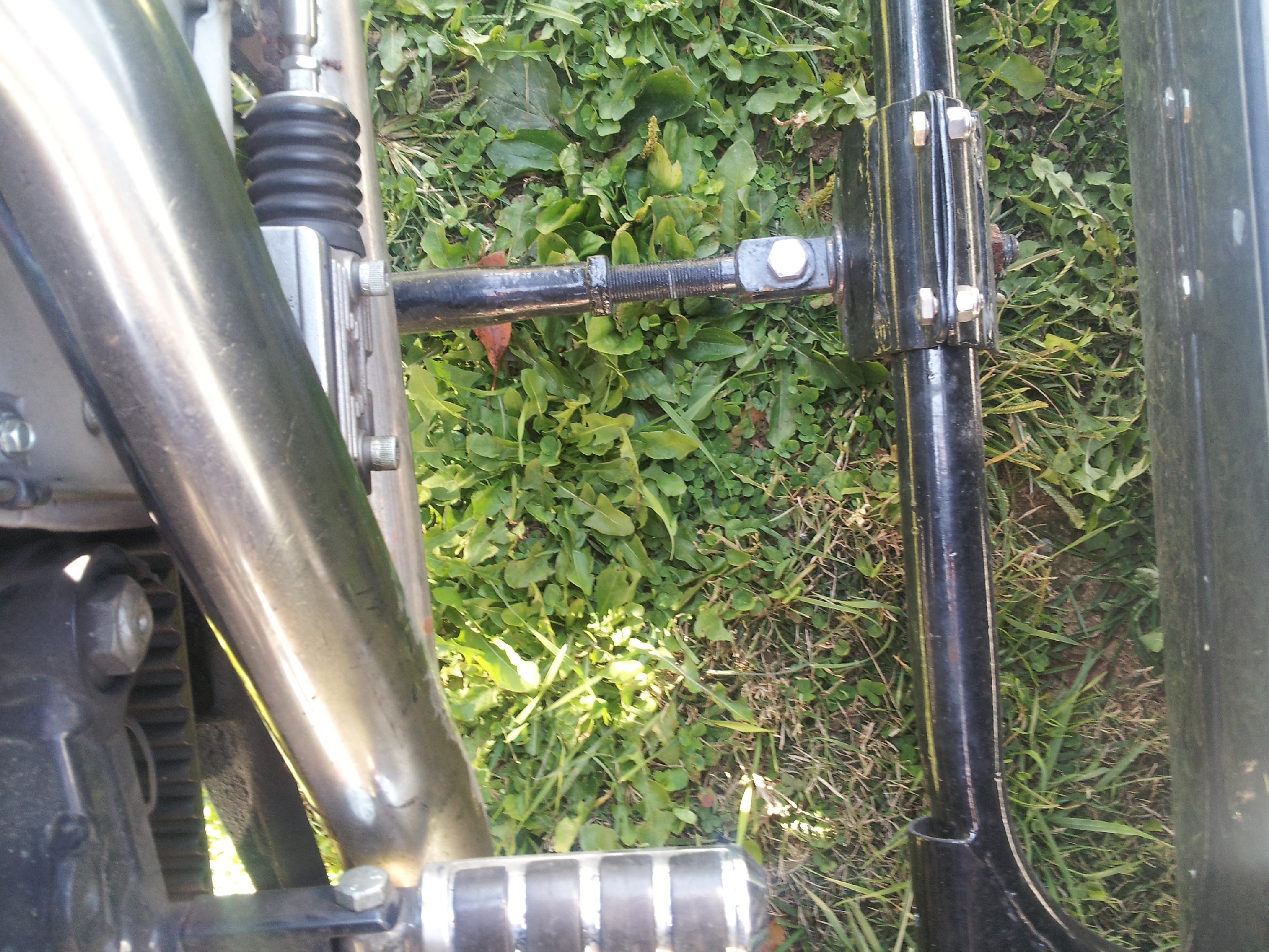 The way you have this mounted will cause you to constantly have to realign the sidecar as it is not a question of if it is going to slip but more when it will slip. Triangulation should be much better then it is. Where you have your front lower mount placed leads me to believe that you more then likley have way to much wheel lead on this and as such you will have heavier steering then need be, more tire wear and a tendency for a head shake. Here is a link to our site showing a similar rig that came into our shop and how we fixed it http://www.dmcsidecars.com/703/the-result-of-improper-sidecar-mounting-and-the-proper-fix/ This rig had very poor triangulation of the mounts and as such they had slipped and the person who mounted it had attached the rear lower mount to the swing arm!!!! which is just about the dumbest way I have ever seen to attach a mount.