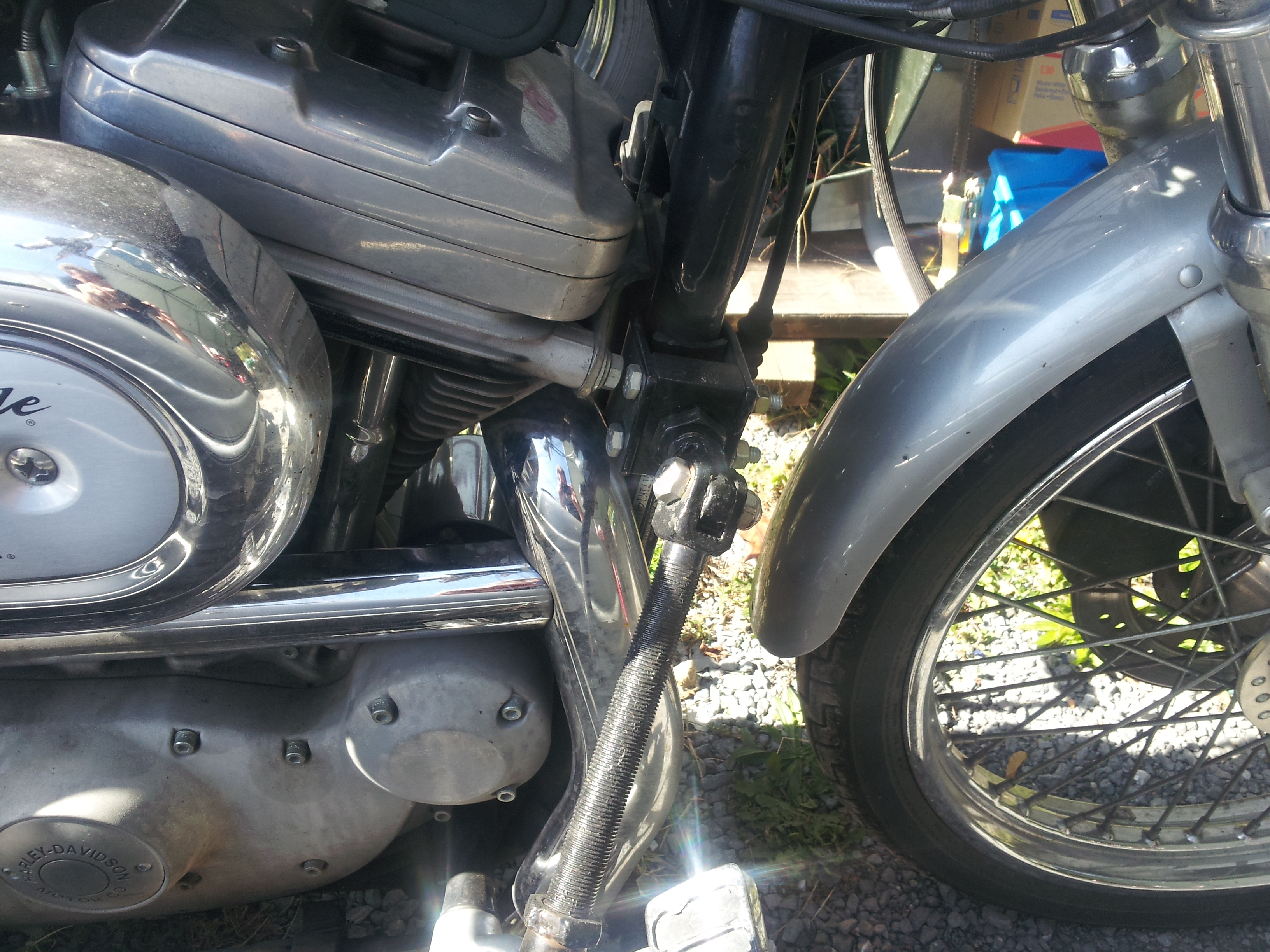 Thanks for the Advice guys . Lonnie i will try to reduce pics and see if I can get that lower mount relocated. Sven so far (knock on wood) I ahve not had any movement. I have be running it since July of '11 and removed the sidecar over the winter and had the frame powder coated and reinstalled . I have a gravel road and driveway, and have been on some bumpy old unmarked roads and no movement yet.In September Aiden and I went on a 7 day 1350 road trip to the Tail of the Dragon in TN / NC and several other really twisty roads. There is always room for improvement though. Thanks guys.