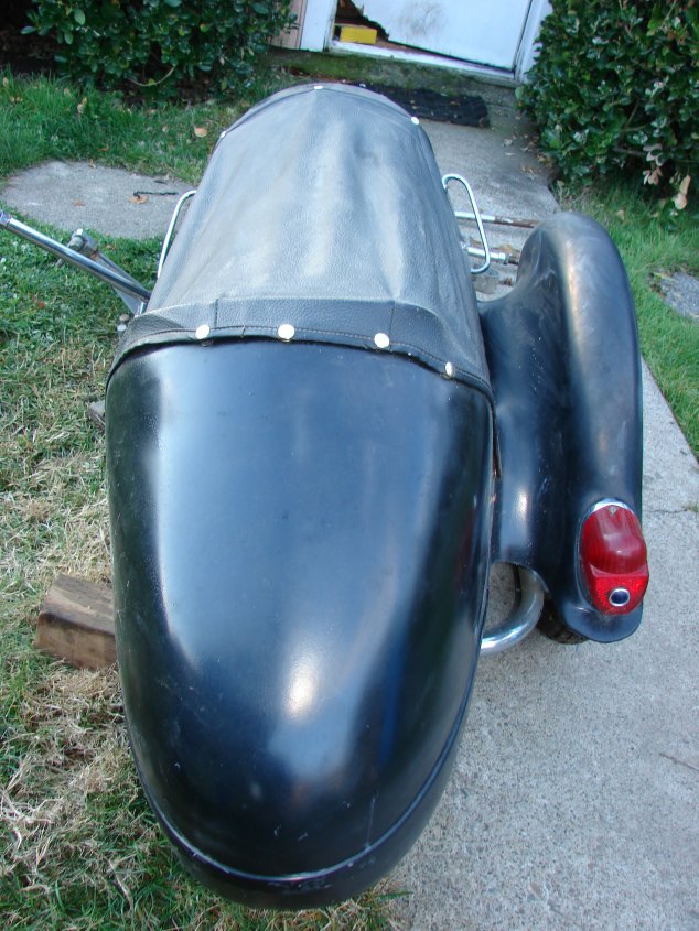 MOLDED FENDER, BRIT TAILLIGHT, I'D SAY SPIRIT OF AMERICA. COULD BE EARLY (VERY) CALIFORNIA. THE MOLDS MADE THEIR WAY AROUND TO SEVERAL COMPANIES AND VARIOUS NAMES BUT I'VE FOUND THAT MOST OF THE MOLDED FENDER BODIES WERE SPIRITS. A NICE, LIGHT, $500.00 (IF COMPLETE) SIDECAR. QUOTE]